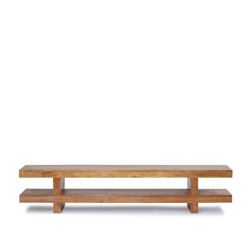 Made from mango wood in a natural sealed finish, the Zen entertainment unit has two long flat open surfaces joined by solid straight legs for maximum support.