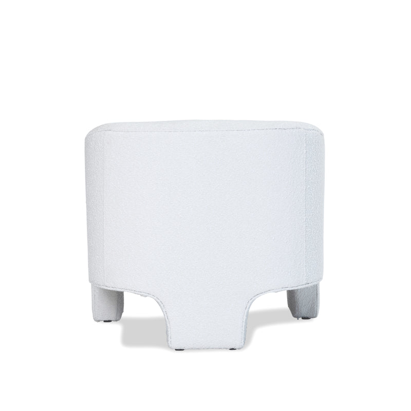 - Features three legs, cream boucle upholstery, padded seat and curved shape.