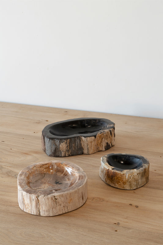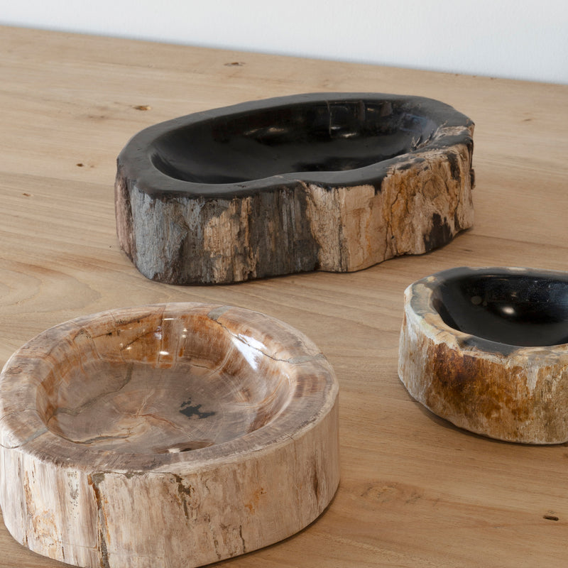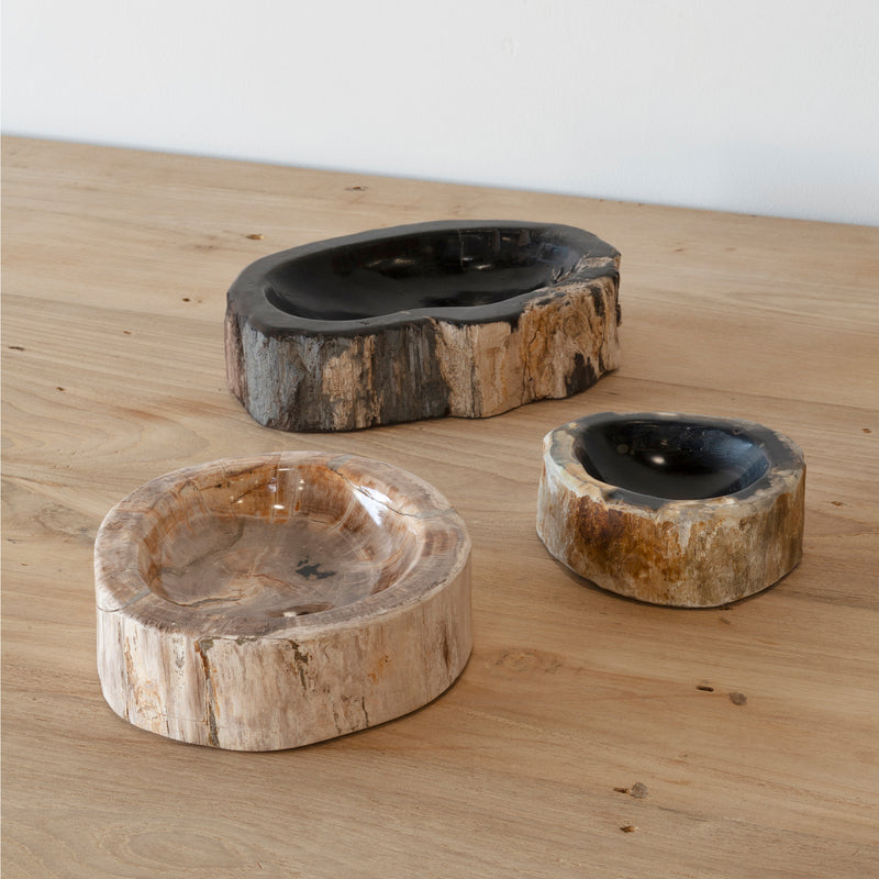 Made from petrified wood, over a period of millions of years wood has been fossilized and transformed into stone. Hand-cut and hand-polished into bowls, plates and candle holders, these conversation starters are a beautiful decor piece for any home. Every piece will be completely unique in shape, size, tone, colour and texture, all adding to the characteristic and beauty of the pieces.