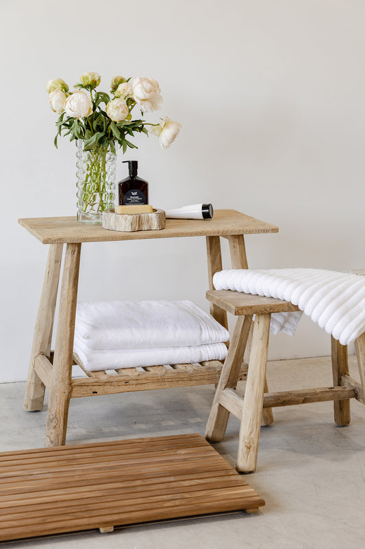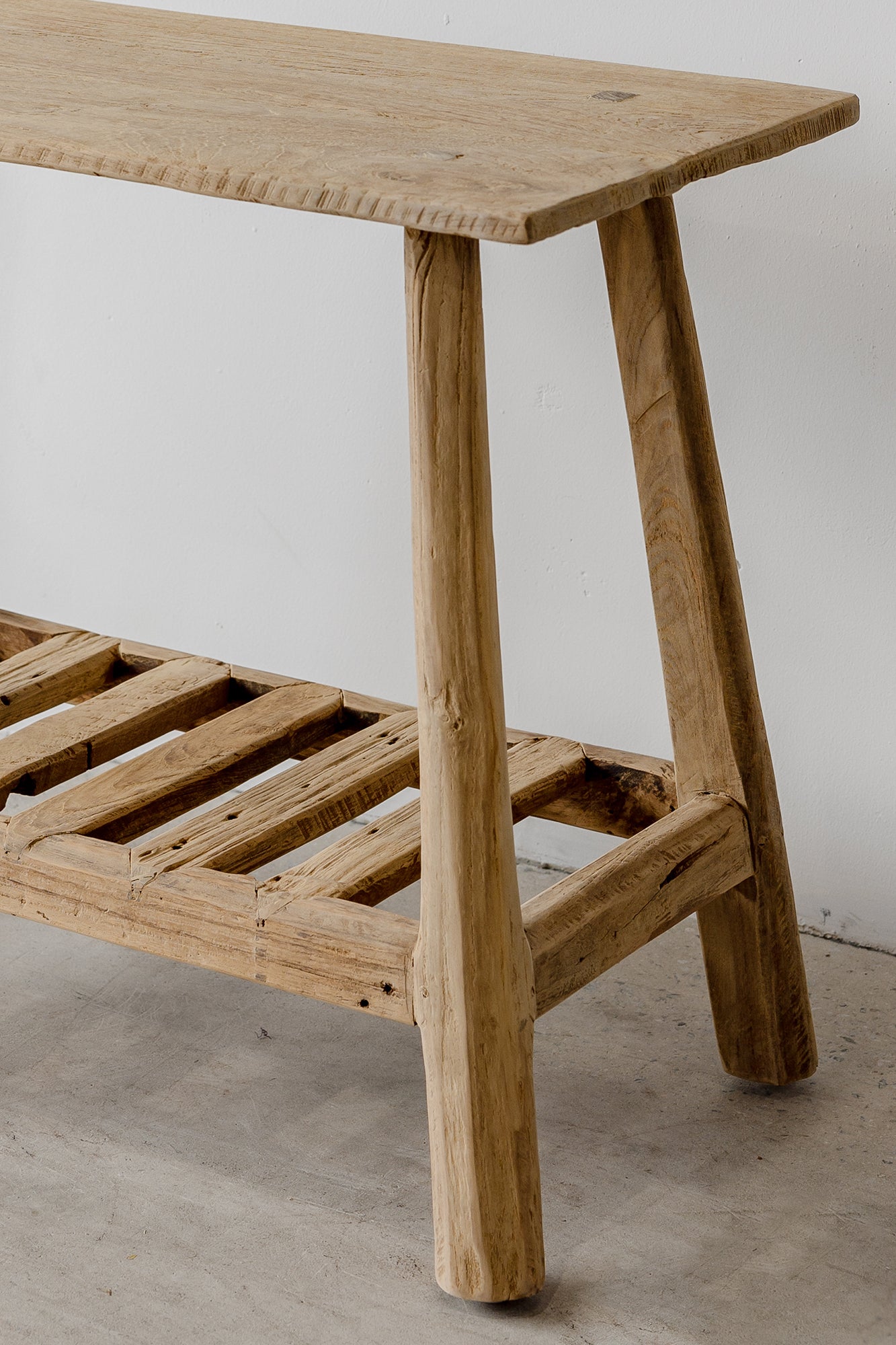 Crafted from solid teak hardwood in a natural raw finish, the Organic Teak Console is defined by its simple form and organic character. The streamlined profile is complemented by a practical lower slatted shelf, offering subtle storage while allowing the natural grain and texture of the timber to take focus. A timeless piece suited to bathrooms, entryways, living spaces or bedrooms.