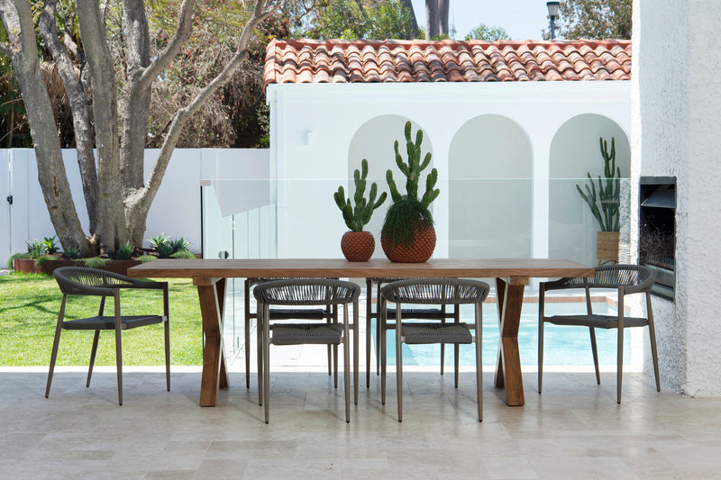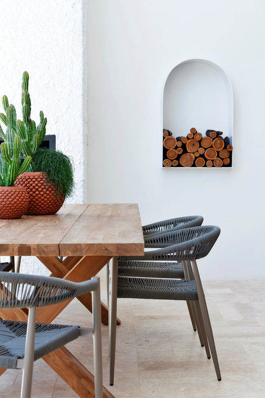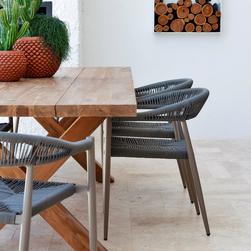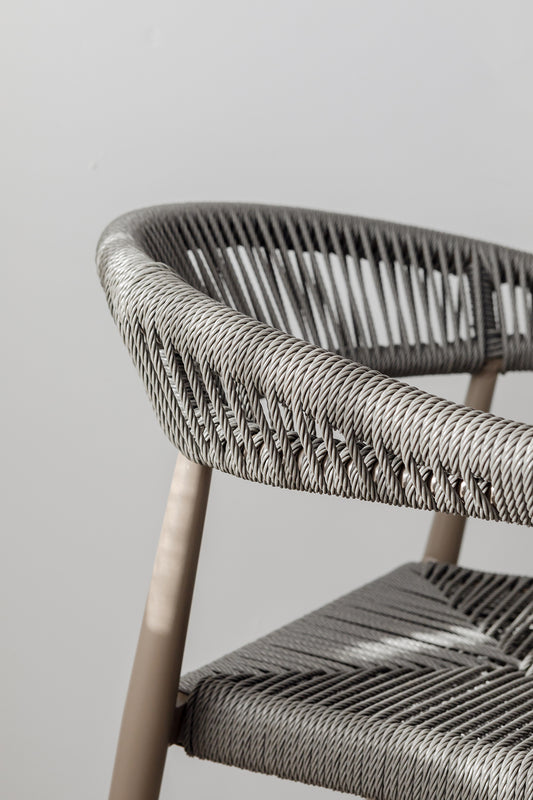 Introducing the Campari Chair. A beautiful outdoor chair crafted from a powder coated aluminium frame and nylon rope. These stackable chairs combine sleek aesthetics with exceptional durability, ensuring they withstand the elements while maintaining their vibrant look. Perfect for patios, gardens, or poolside lounging.