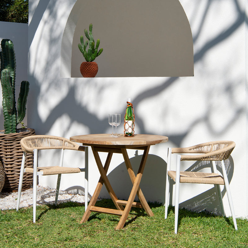 Constructed from durable Teak hardwood in a natural finish, with a circular table top. The folding table is lightweight and easily folded when not in use.