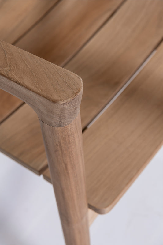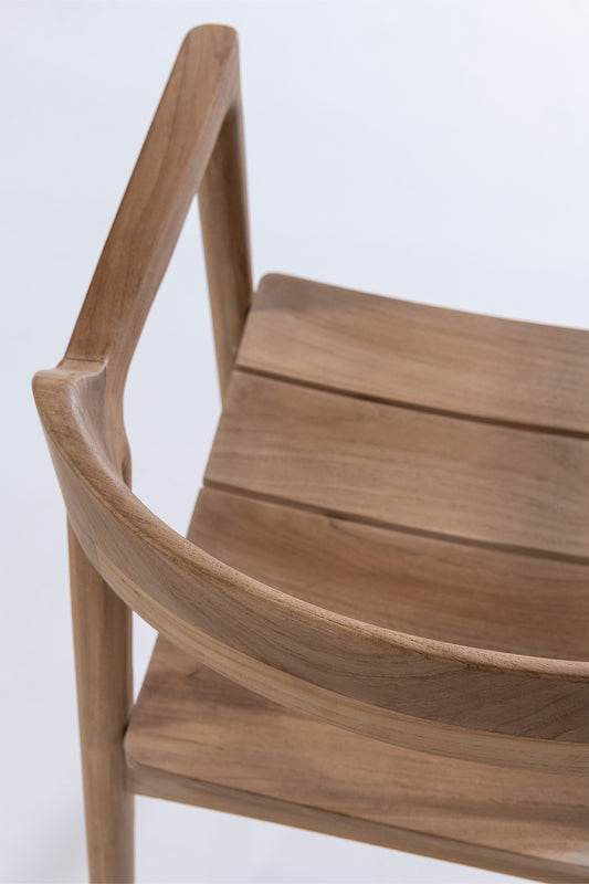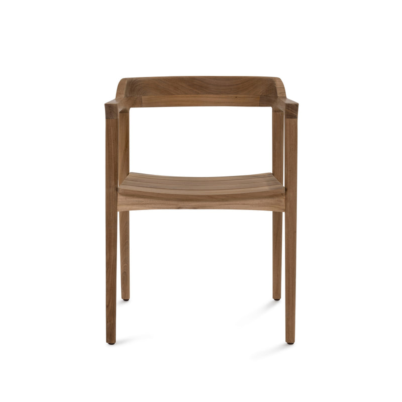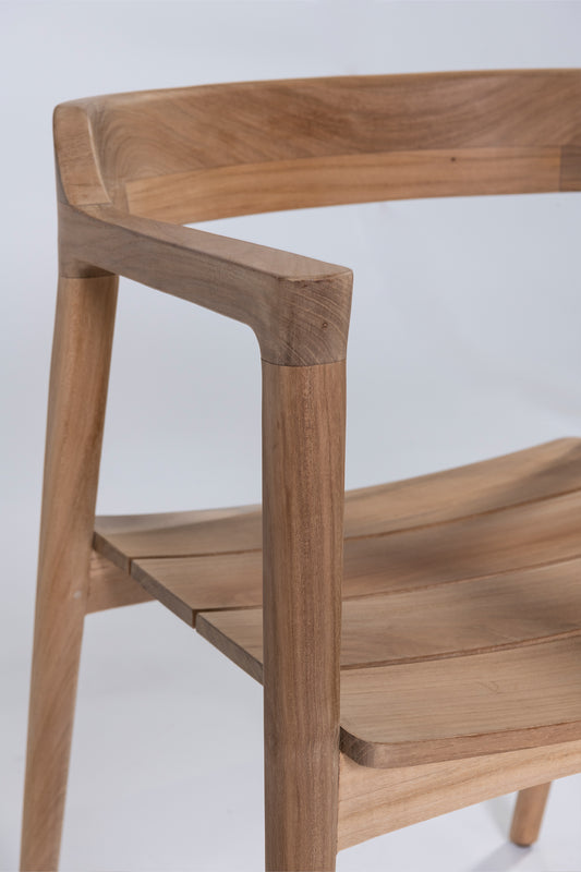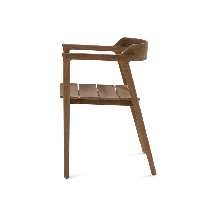 The Max Outdoor Chair, features a modern, versatile design with curved back rest and slatted seat. Constructed from durable teak hardwood in a raw finish.