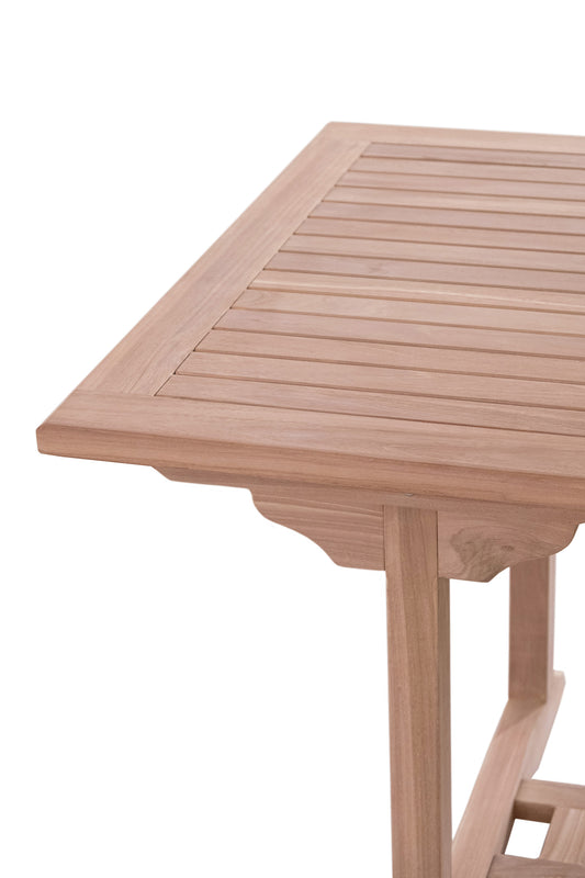 Sleek and generous in scale, this large extendable dining table combines refined craftsmanship with the natural warmth of solid teak. Featuring a clean-lined slatted tabletop and sculpted trestle legs, the design offers a balanced, architectural presence. A discreet extension allows the table to expand effortlessly, making it ideal for larger gatherings and long, relaxed meals. Timeless and versatile, it brings understated elegance to alfresco settings, covered outdoor spaces, and relaxed interiors.