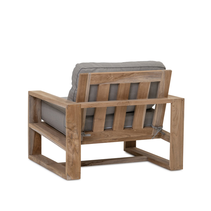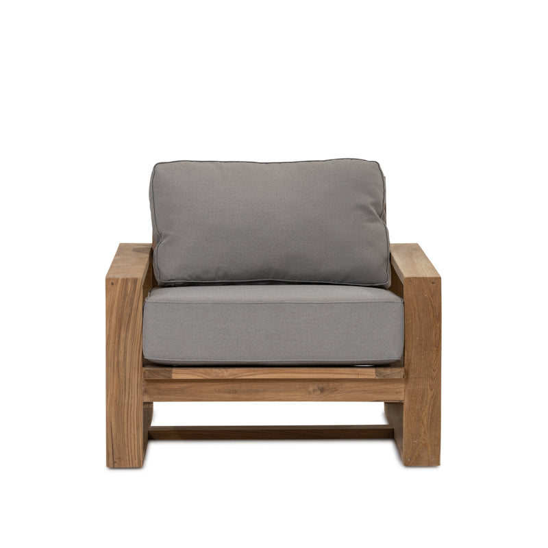The Sahara 1 Seater Sofa, features a sleek and modern design constructed from durable teak hardwood in a raw finish, complete with water-resistant cushions in sunproof Praia 161 fabric.