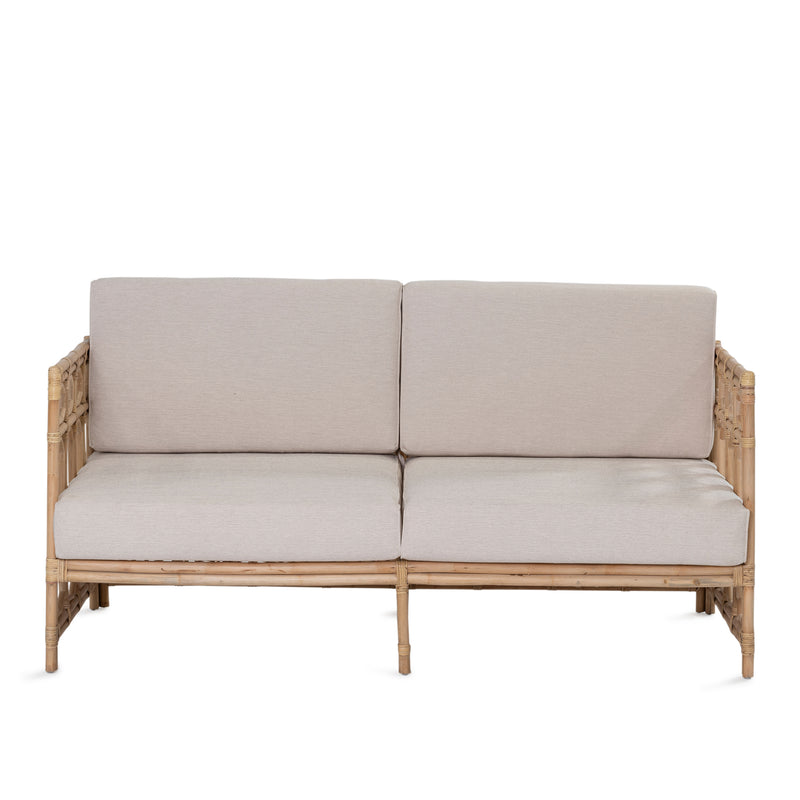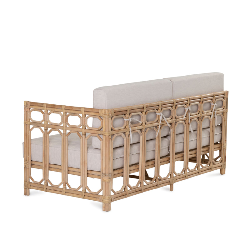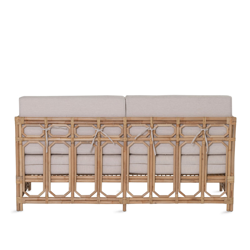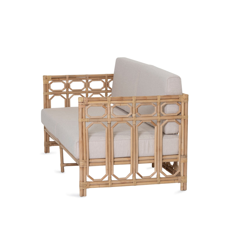 The Santorini Daybed, features a stylish cane frame in natural finish and comfortable fabric cushion in Bahama Sands upholstery. Comes with 4 detachable cushions that can be tied to the frame.