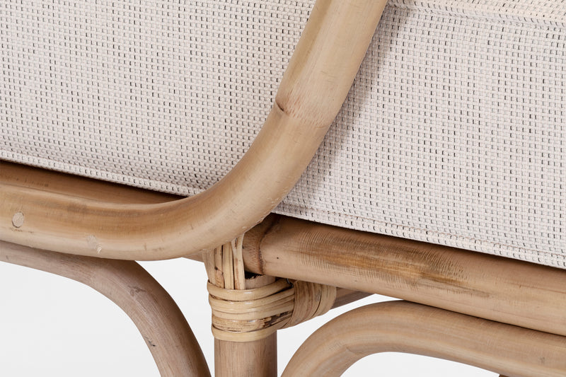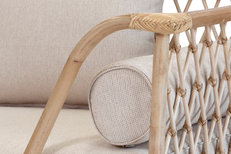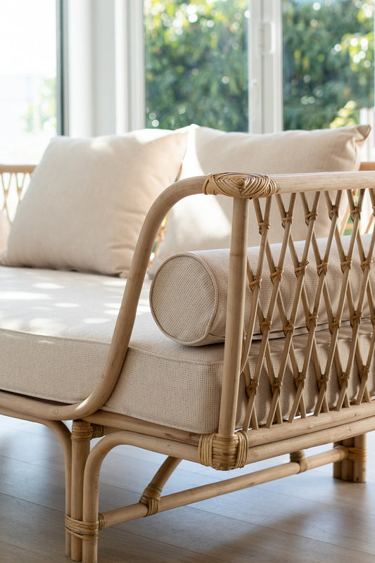 The Avalon Daybed, features a stylish and durable cane frame in natural finish and comfortable fabric cushion seat in weather proof Bahama sands upholstery. Comes with 2 x rectangular cushions and 2 x circular tube cushions.
