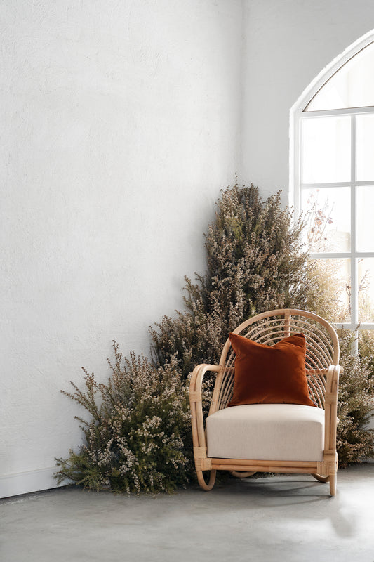 Durable rattan frame occasional chair with detailed rattan backrest and comfortable fabric cushion seat.