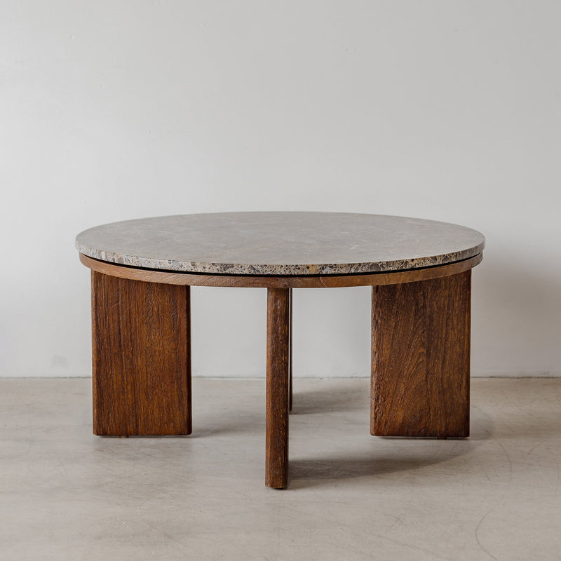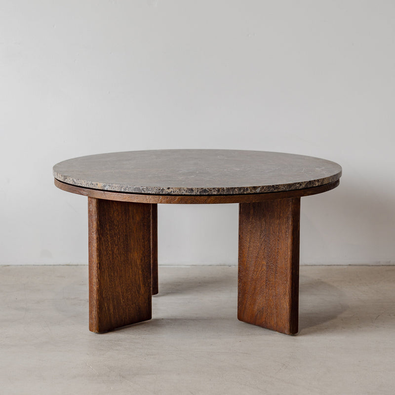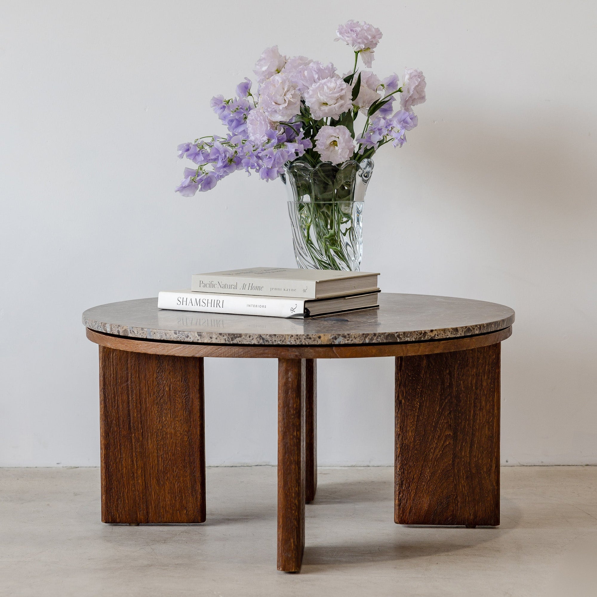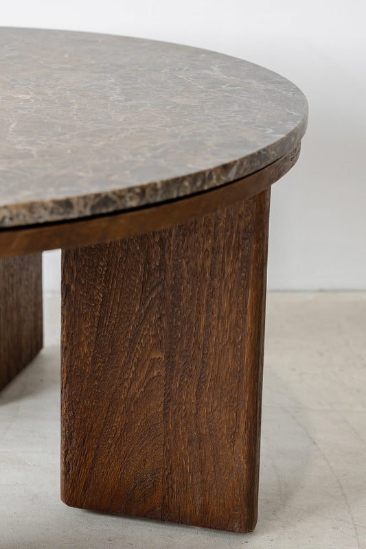 The West Coffee Table in Rustic Walnut with Choc Marble Top is a refined balance of form, function and versatility. Crafted from solid timber, its circular marble top rests on four architecturally angled legs. Designed to be rotated, the table reveals different silhouettes, allowing the piece to subtly shift in character depending on its orientation.