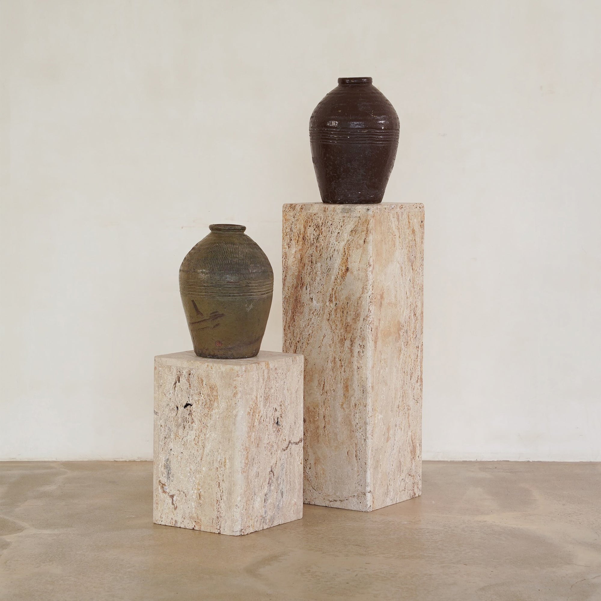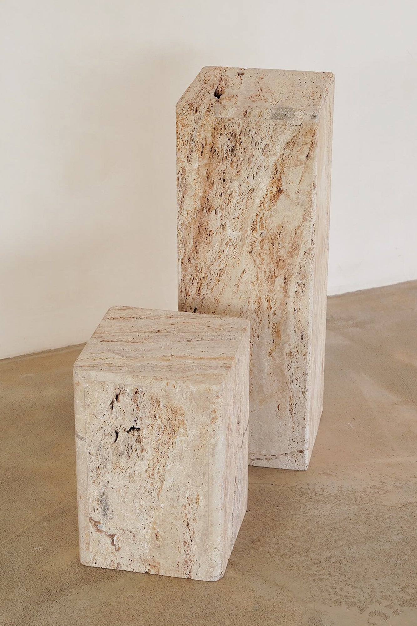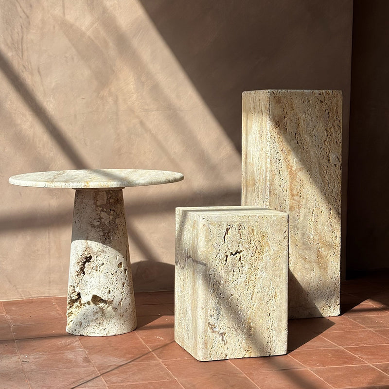 Crafted from solid travertine, this plinth celebrates the raw elegance of nature. Whether styled with art, florals, or as a statement side table, it lends timeless character and sculptural presence to any interior.