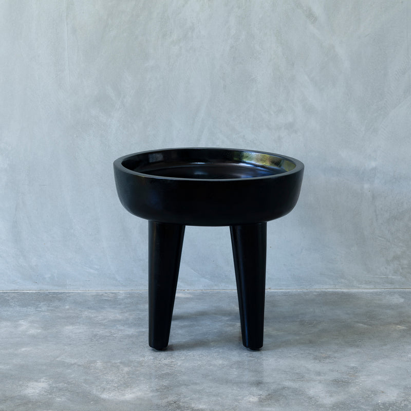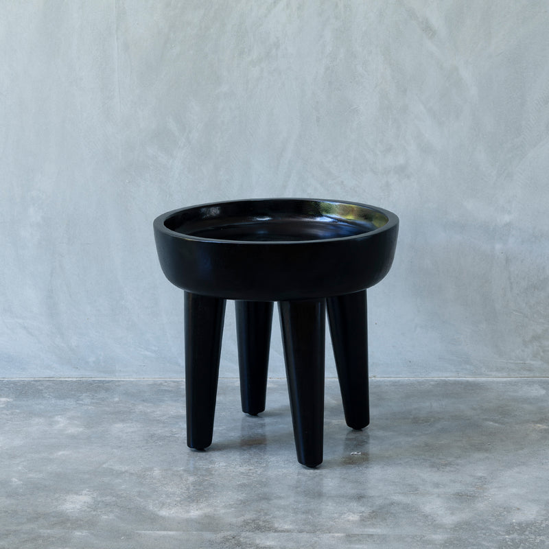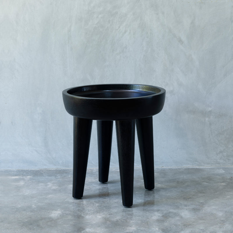 Unique wooden side table, made from solid meh wood, with classic round, bowl shaped top and four slightly tapered legs. Available in two sizes.