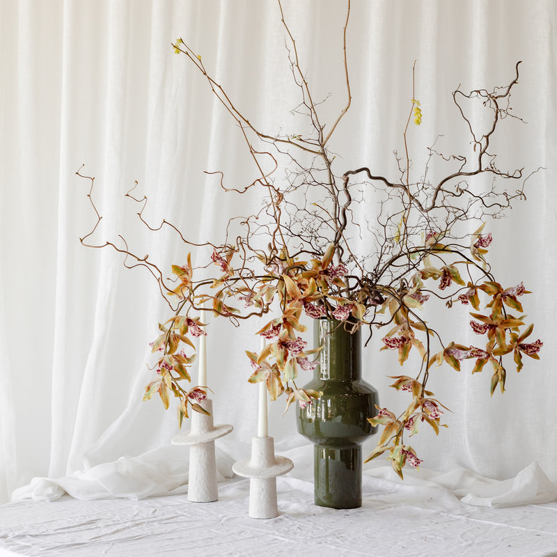 Crafted from iron, the Dahlia Vase features a sleek olive enamel finish that adds a touch of elegance to any room. Elevate your home decor with this timeless piece.