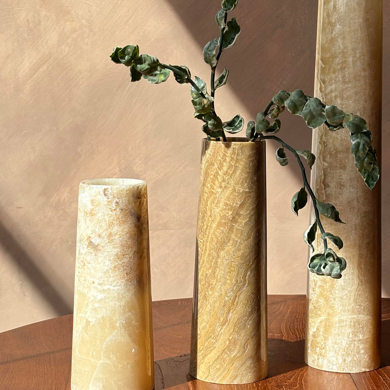 Made using natural onyx, each cylindrical vase showcases unique patterns and soft, earthy tones, making it a striking accent for any space. Ideal for your favourite flowers or as a standalone statement.