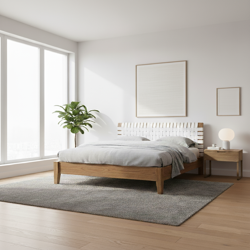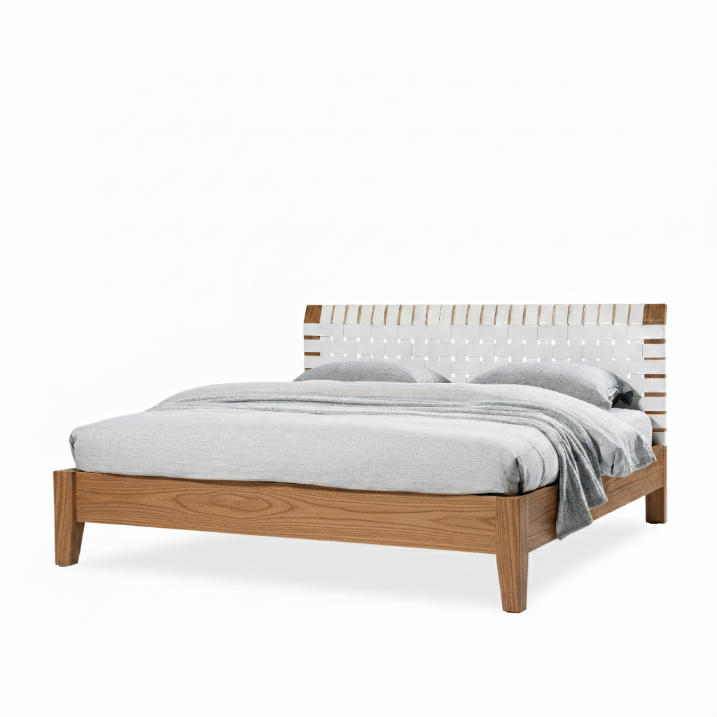 The Amsterdam Bed brings timeless texture and natural warmth to the bedroom. Crafted from solid mindi wood in an antique finish, it features a handwoven white leather headboard that adds refined contrast and sophistication. Built with exceptional joinery and solid hardwood slats, the Amsterdam Bed balances enduring craftsmanship with contemporary design.
