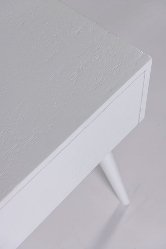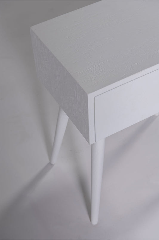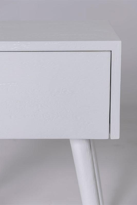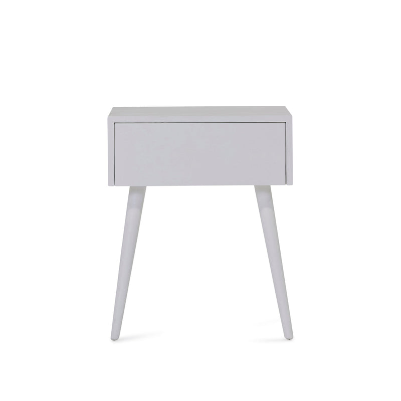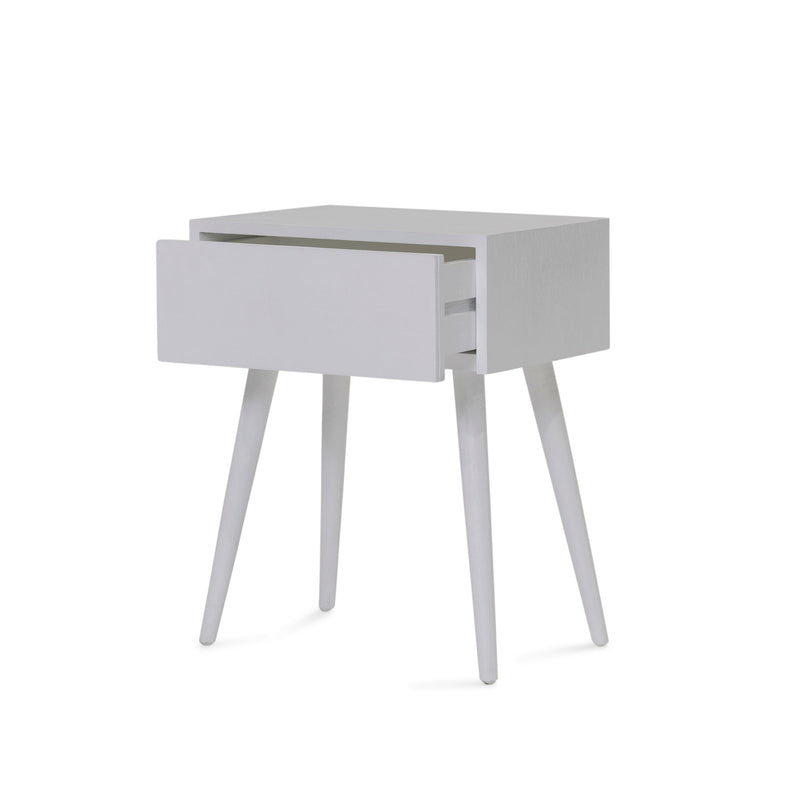 The Amsterdam bedside without shelf has one drawer with four tapered legs. Built from solid mango wood in white finish.