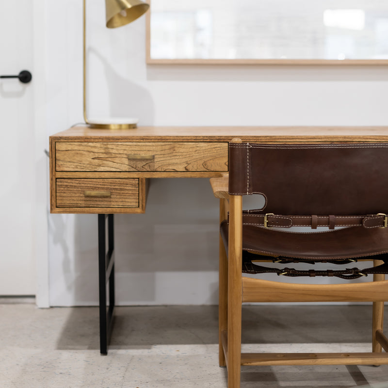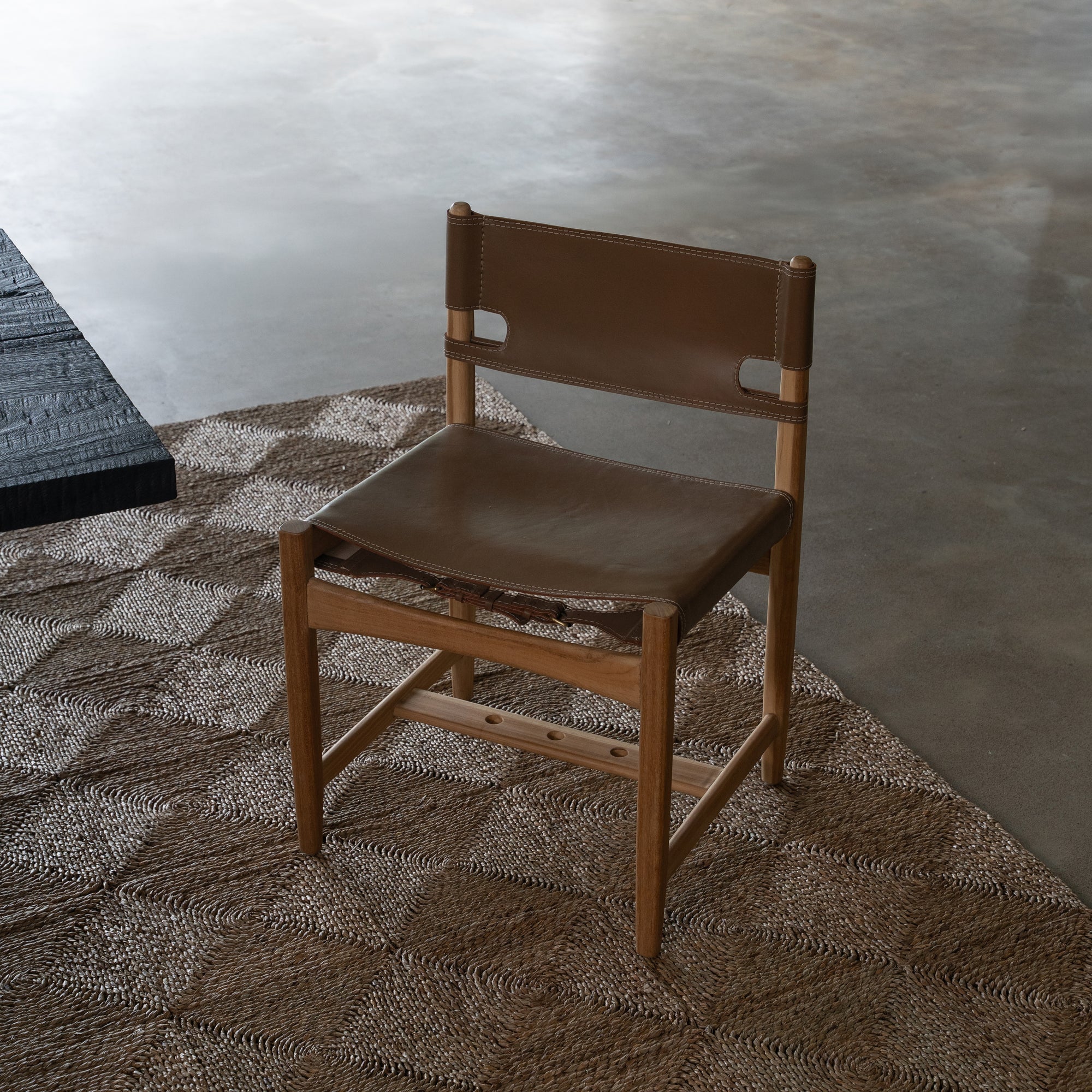 - Sustainability sourced teak hardwood frame with walnut leather back rest and seat.