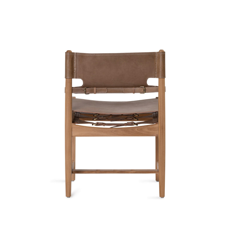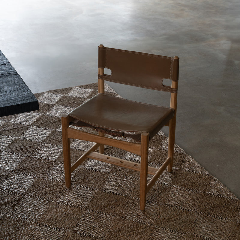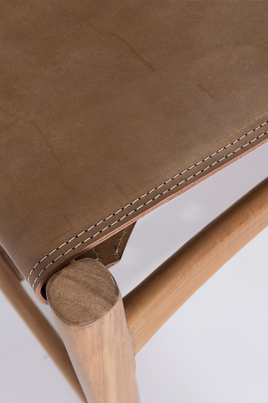 The Austin Side Chair is elegant, comfortable and practical. Featuring a tan leather backrest and seat with white hand stitched detail on a teak hardwood frame in a raw finish.