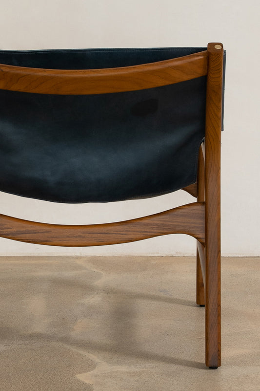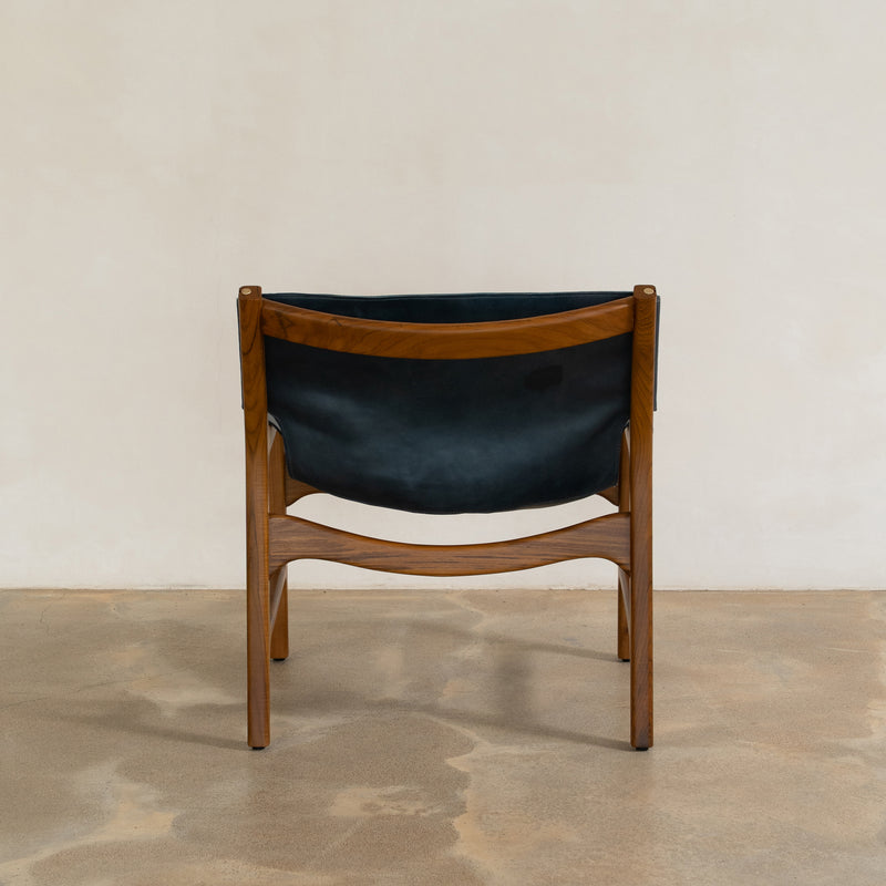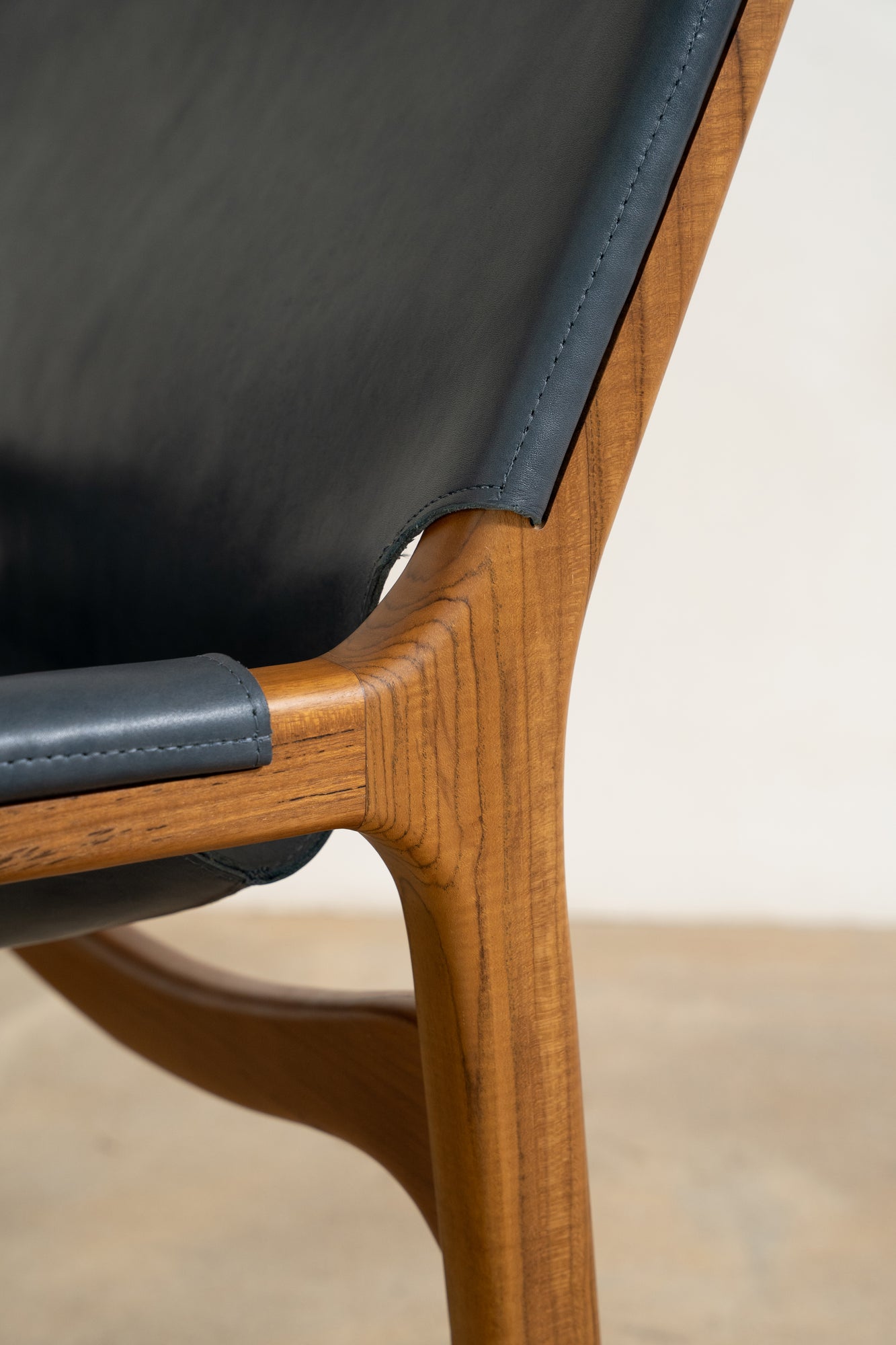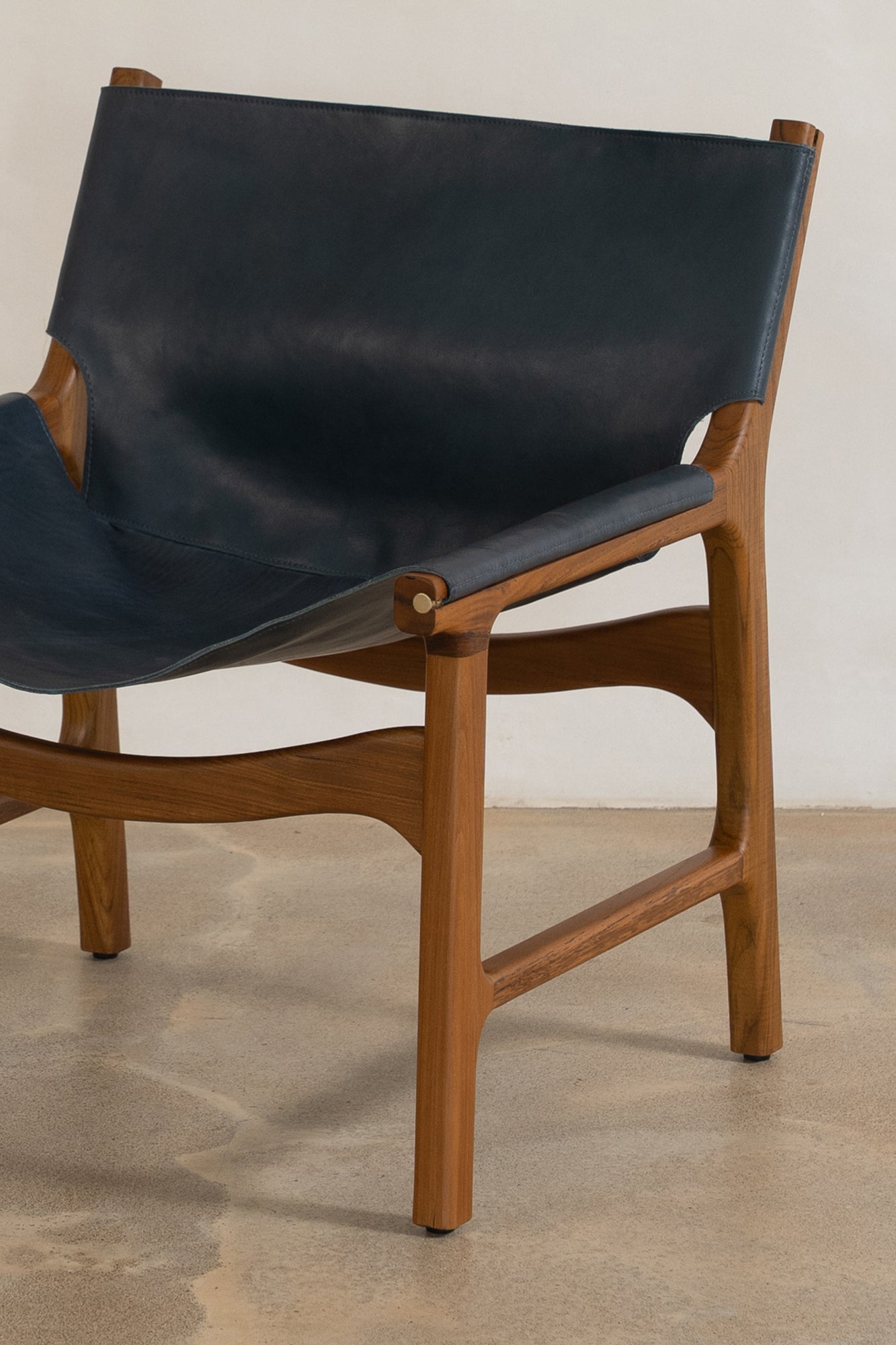 - Natural teak hardwood frame, Pacific Navy leather back rest and seat with Brass detailing