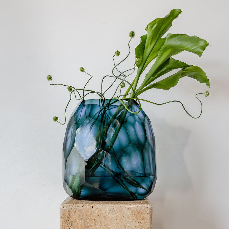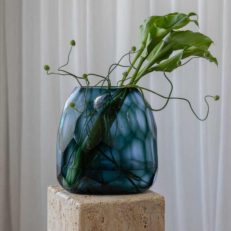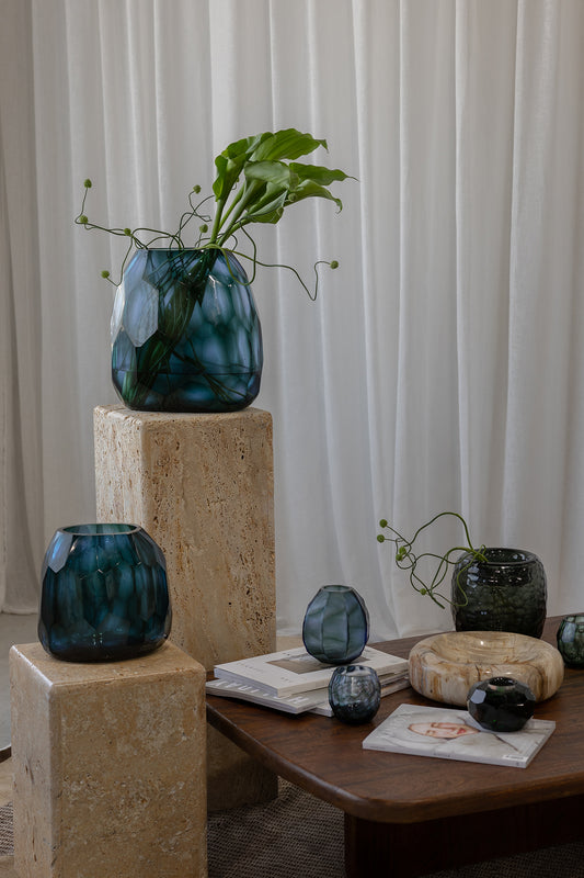 A sculptural centrepiece for consoles, dining tables or open shelving, the Avisa Caspian Vase in Blue brings depth, light and contemporary elegance to any interior. Defined by its softly rounded, oval silhouette and layered blue tone, it captures and reflects light beautifully, creating a sense of movement within the glass. Striking styled alone or filled with stems, it offers an elevated way to introduce colour and form.