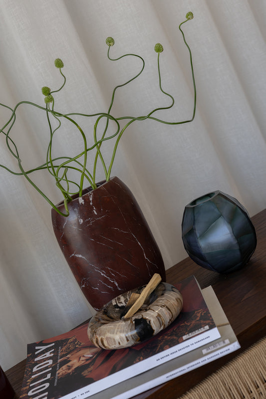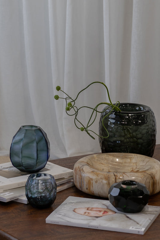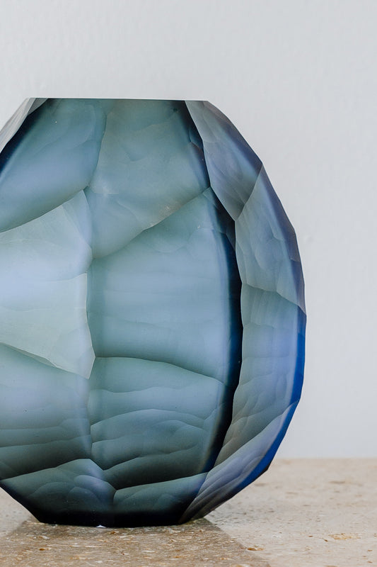 A refined decorative accent for shelves, side tables or console styling, the Avisa Tarni Vase in Blue brings sculptural form and luminous colour to any interior. Featuring a softly faceted silhouette and layered blue tone, it captures light beautifully, creating depth and gentle movement within the glass. Perfect styled alone or with a simple stem, it offers an effortless way to introduce artistry and warmth.