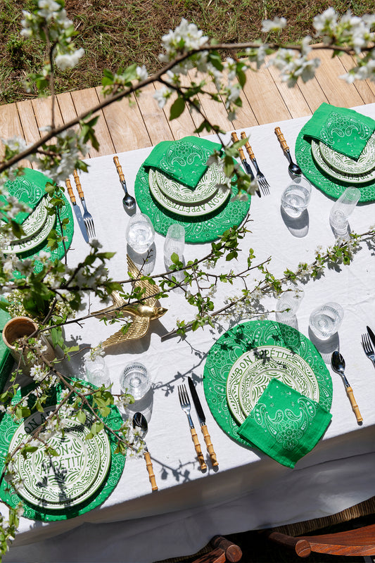Alive with colour and pattern, the Bandana Placemat Cover in Green brings a spirited touch to laid-back dining. Its bold paisley motif is printed on soft cotton, creating an inviting foundation for both everyday meals and long summer lunches.