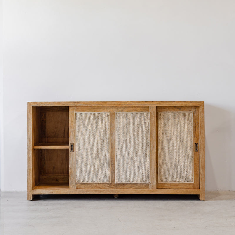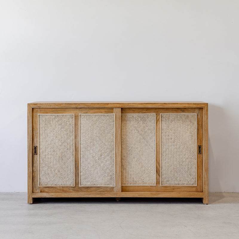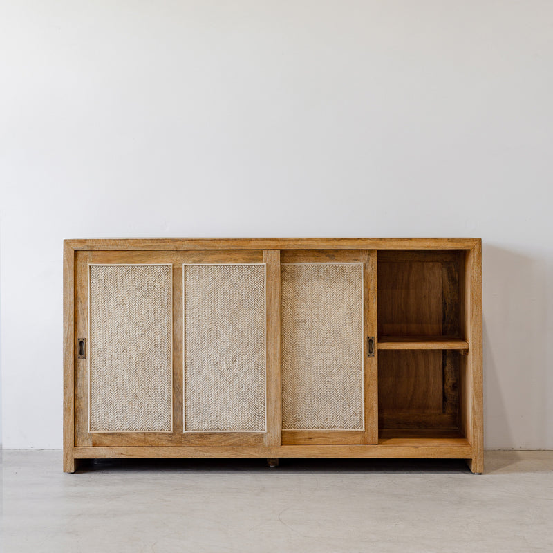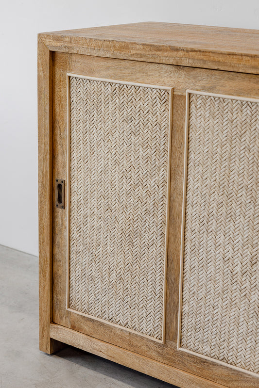 Built from solid mango wood in a Rustic matte finish. Sliding doors with natural rattan weave inserts and solid brass handles.