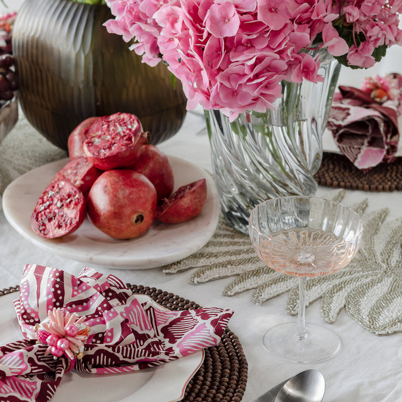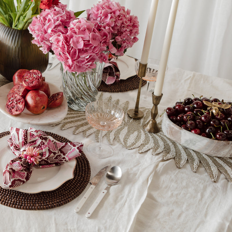 Handcrafted with exquisite beaded glass on cotton, every placemat, runner, and napkin ring boasts one-of-a-kind craftsmanship, featuring intricate patterns that sparkle and elevate your holiday meals. Perfect for layering, the Bianca Table Runner adds warmth, charm, and a touch of elegance to your table.