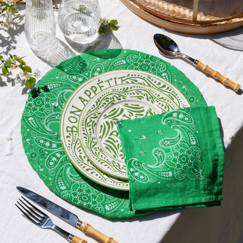 The Bon Appétit Dinner Plate in green brings playful sophistication to your dining table. With its hand-painted detailing and charming French-inspired design, it adds character and vibrancy to any occasion — from everyday meals to festive gatherings. Pair it with coordinating pieces for a cohesive, joyful tablescape.