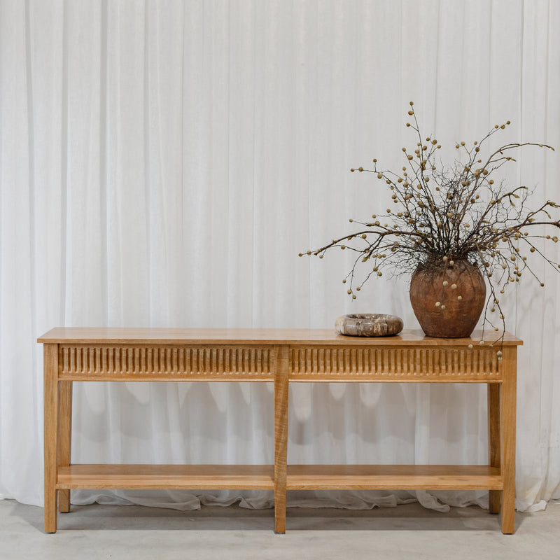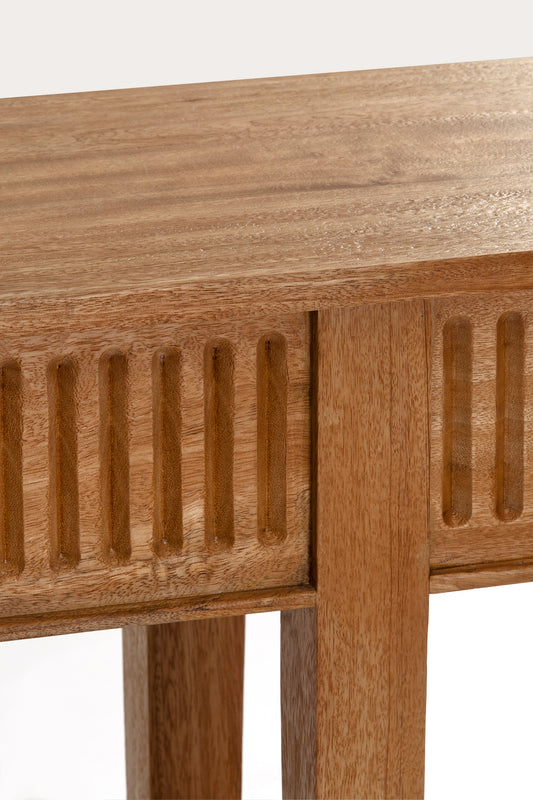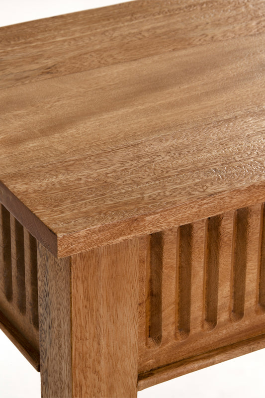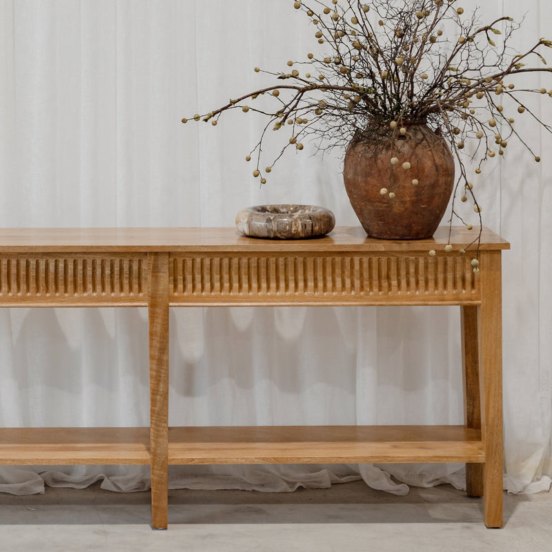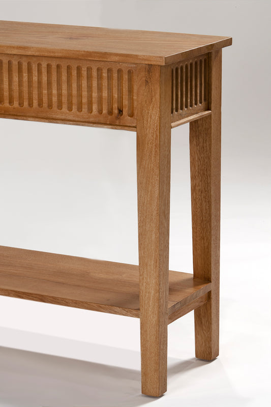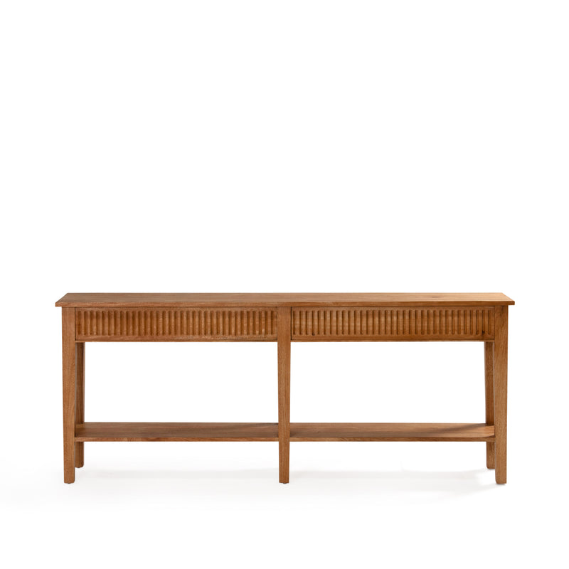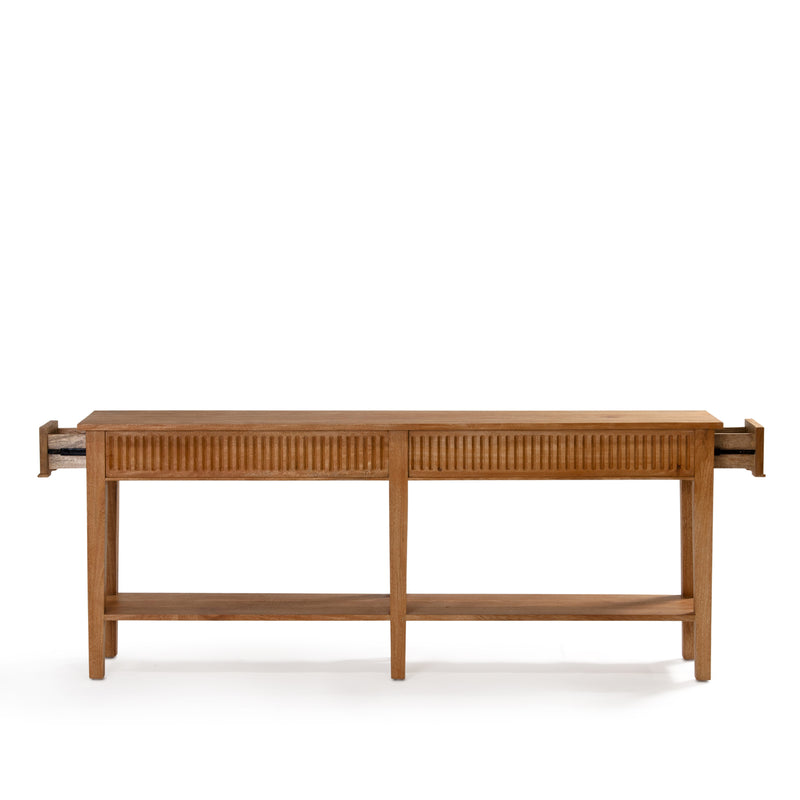Functional console with hidden drawers on each end, and a low solid shelf for additional storage. Built from mango wood in a rustic matte finish.