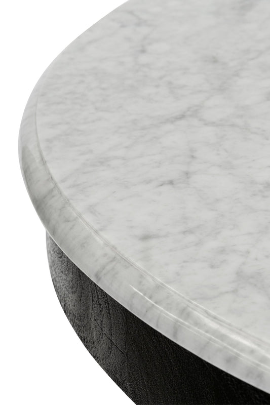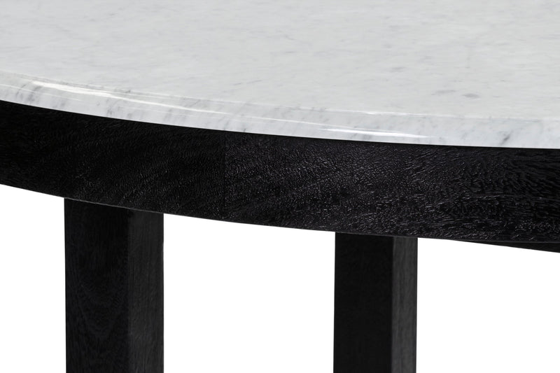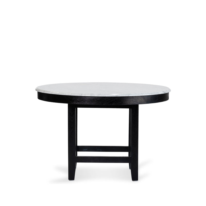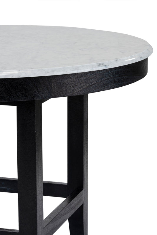 Made from solid mango wood with Black finish. Solid Carrara white marble round top with straight 4 leg base.