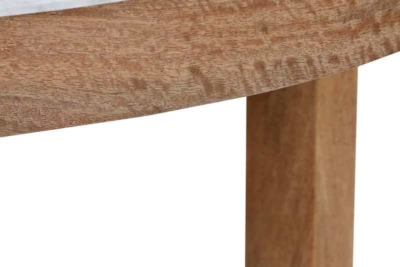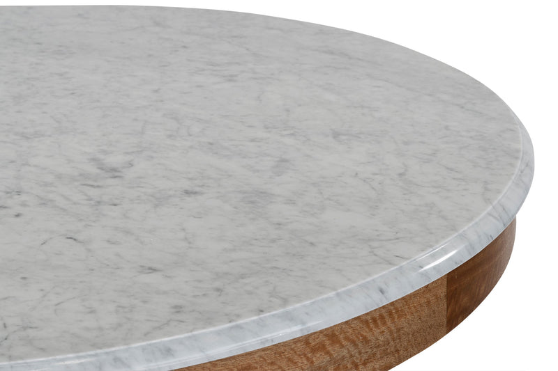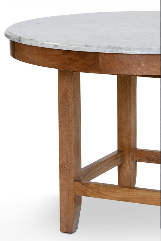 Made from solid mango wood with Natural Sealed finish. Solid Carrara white marble round top with straight 4 leg base.