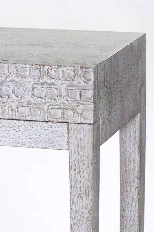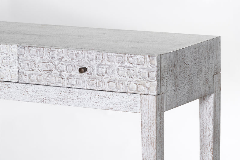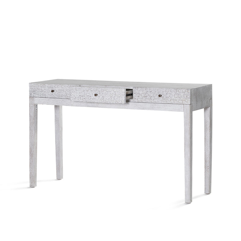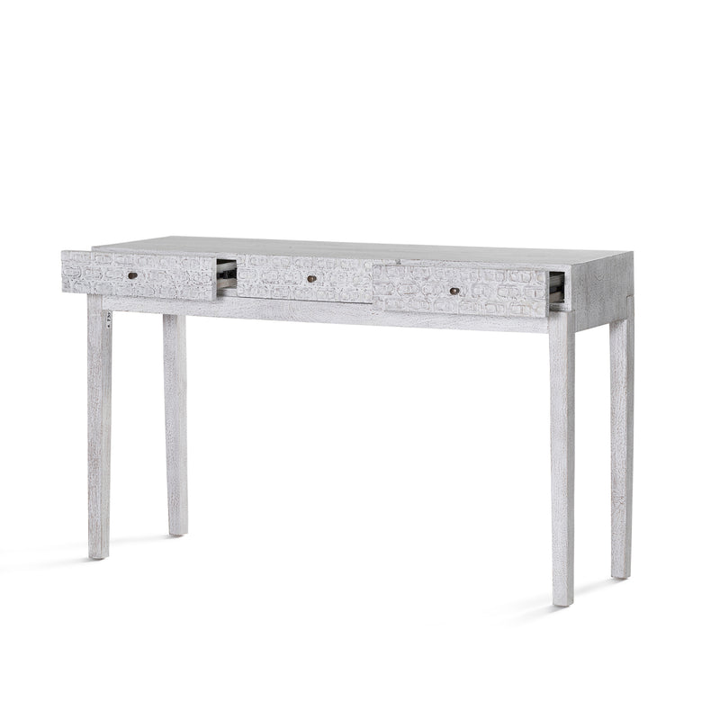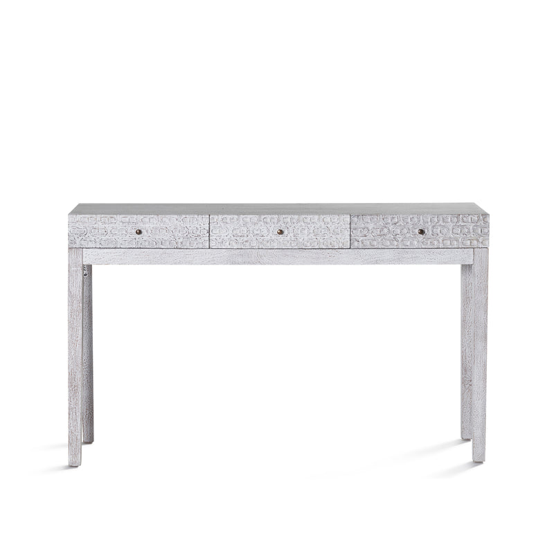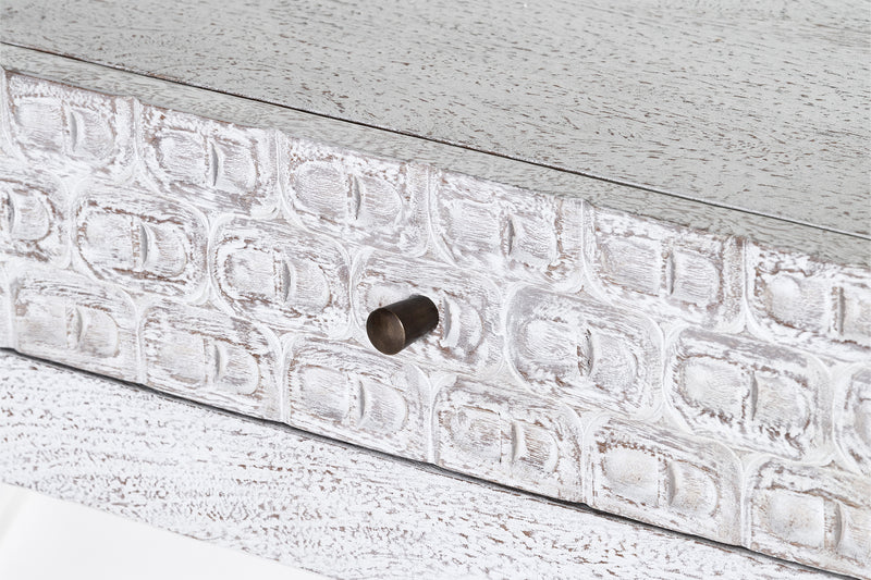 Made from mango wood with a rustic white wash finish, The Dakota console features three drawers with intricately carved detailing on the front, and four elegant straight legs. Perfect for adding a touch of rustic sophistication to any space.