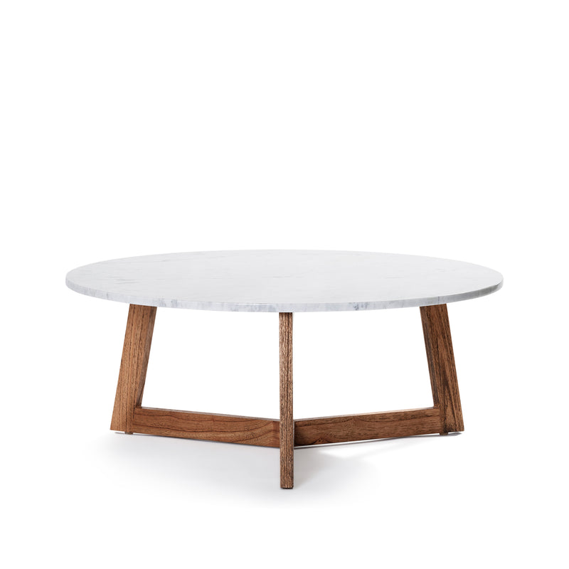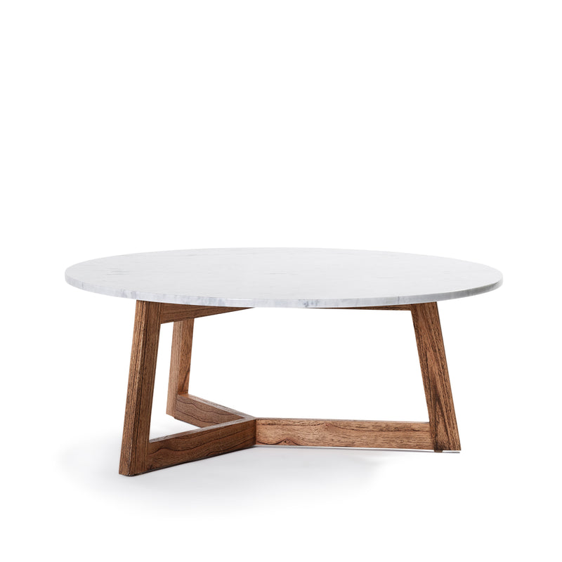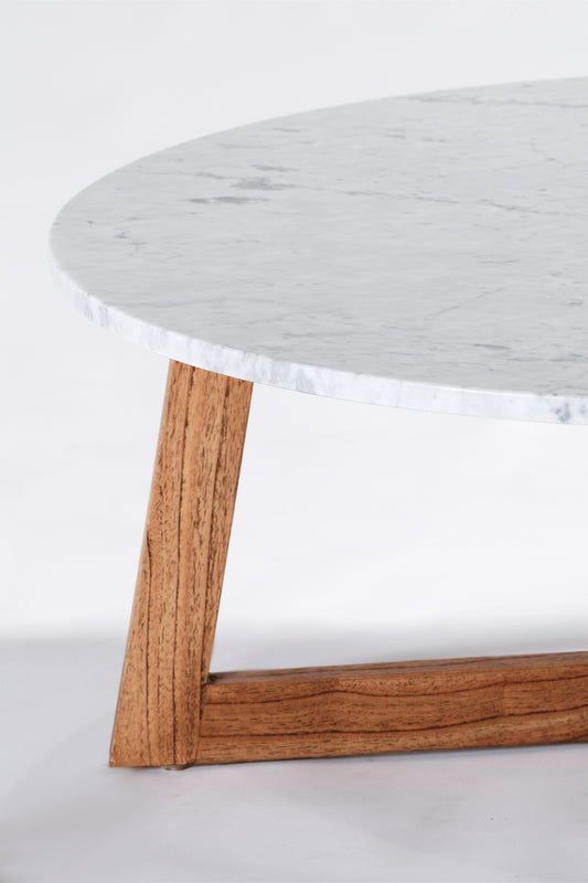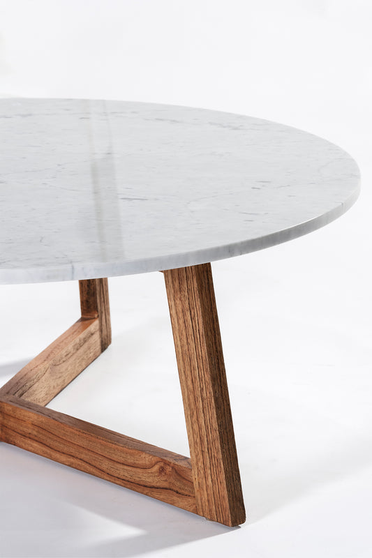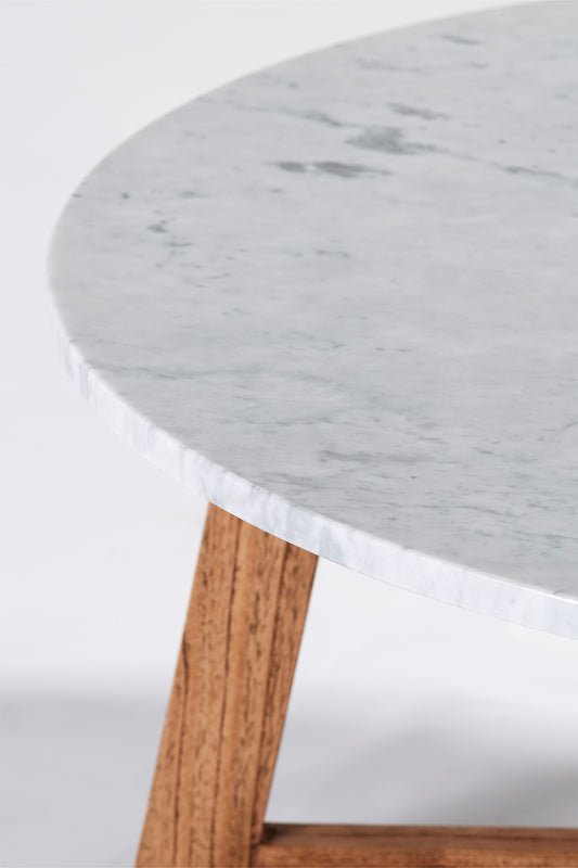 Constructed in sustainable mindi wood. Solid Carrara White marble round top with angled leg base. Available with solid wood top or marble top.