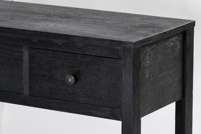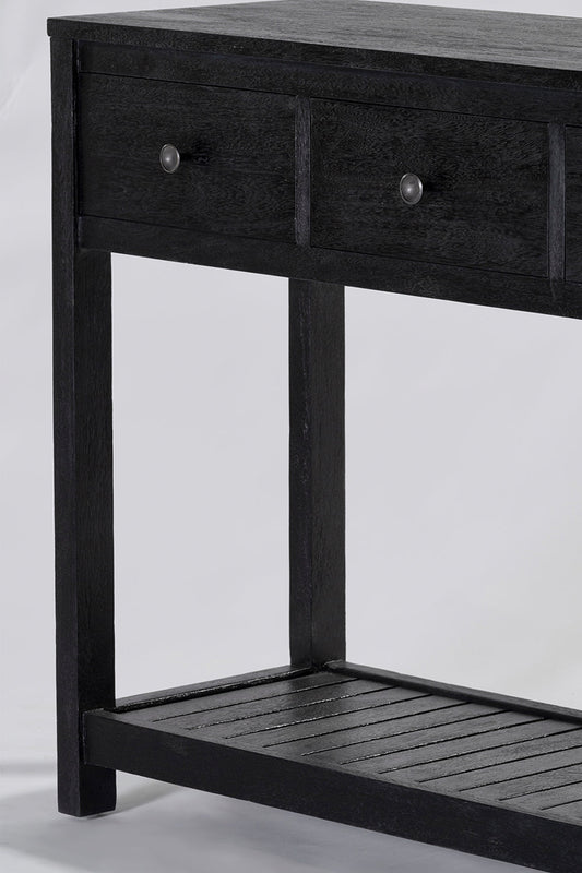 Functional four drawer console with solid brass handles and a low slatted shelf, built from mango wood in a black finish.