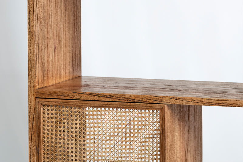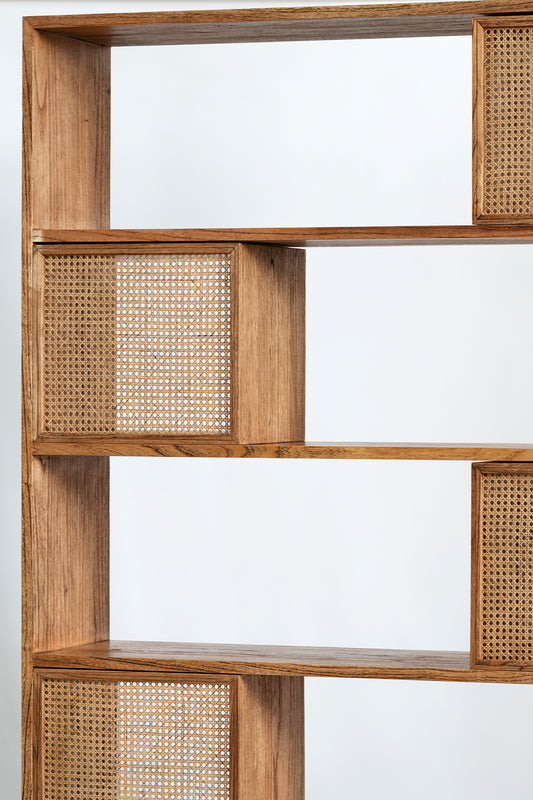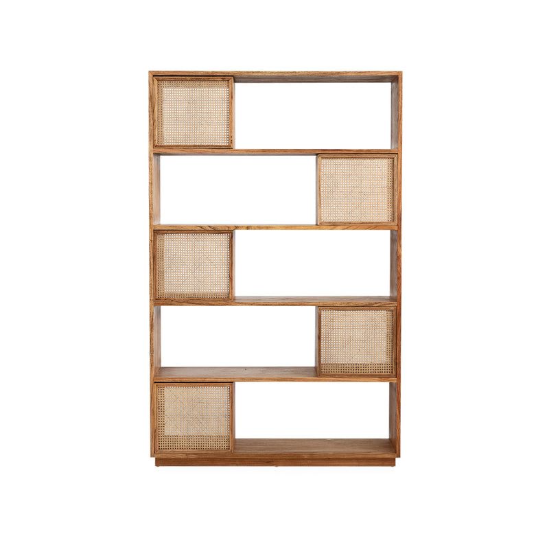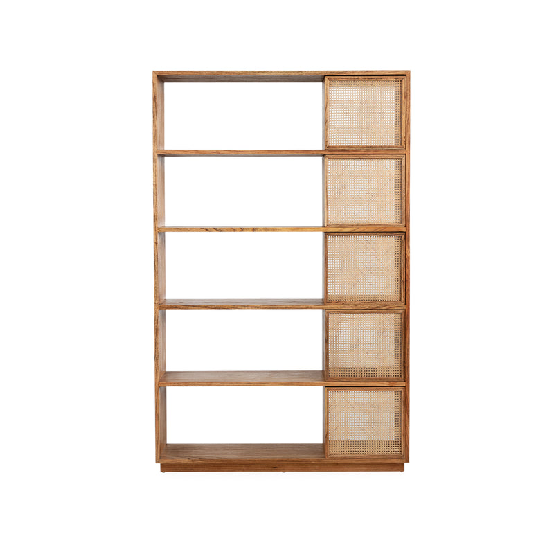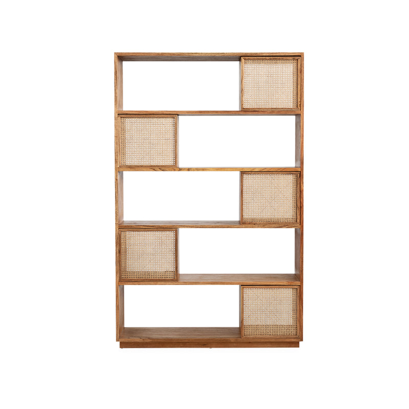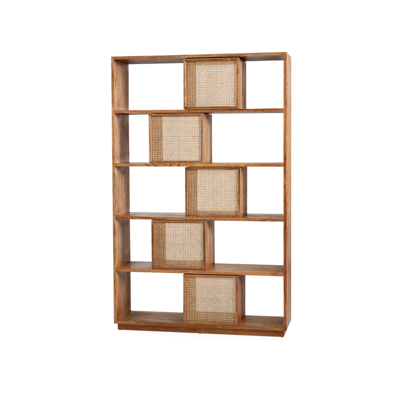 Five shelf bookcase built from Mindi wood in an antique finish. The Elton bookcase comes with five boxes with a rattan insert, which can be positioned as desired.