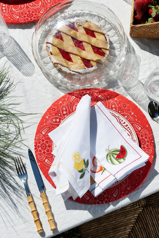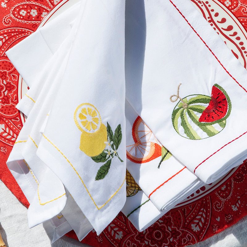 The Embroidered Fruit Napkins bring a refreshing, playful charm to the table. Each napkin features a unique hand-embroidered fruit motif — lemon, orange, and watermelon — stitched in vivid threadwork that captures the essence of summer gatherings.