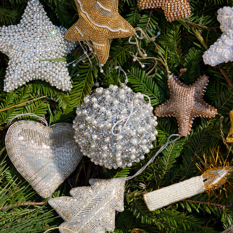 Meticulously hand-beaded with clusters of lustrous faux pearls and shimmering silver details, this ornament reflects light beautifully and adds depth to your tree décor. A true statement piece that pairs seamlessly with both traditional and modern holiday themes.