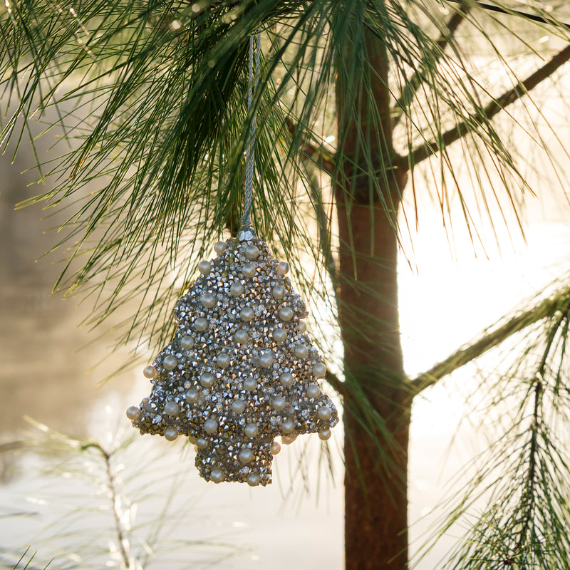 Adorned with clusters of pearls and faceted silver beads, this elegant ornament reflects light beautifully — capturing the magic of the season with refined texture and timeless charm. Perfect for hanging on the tree, styling a wreath, or elevating a holiday table setting.