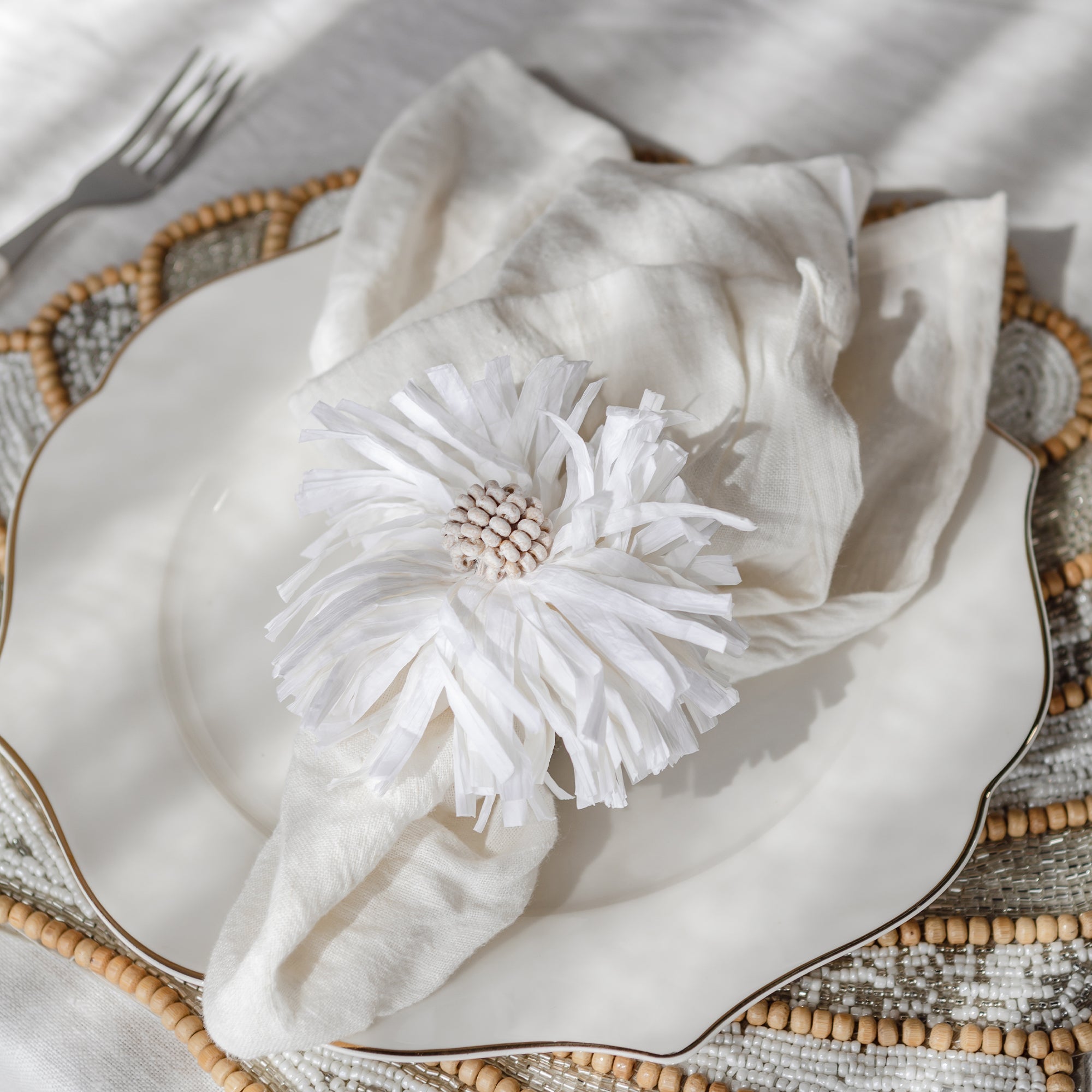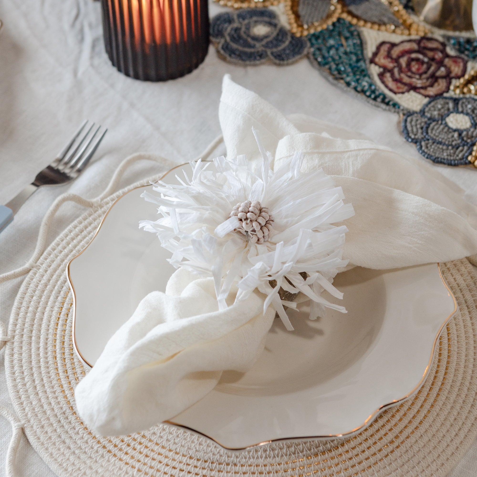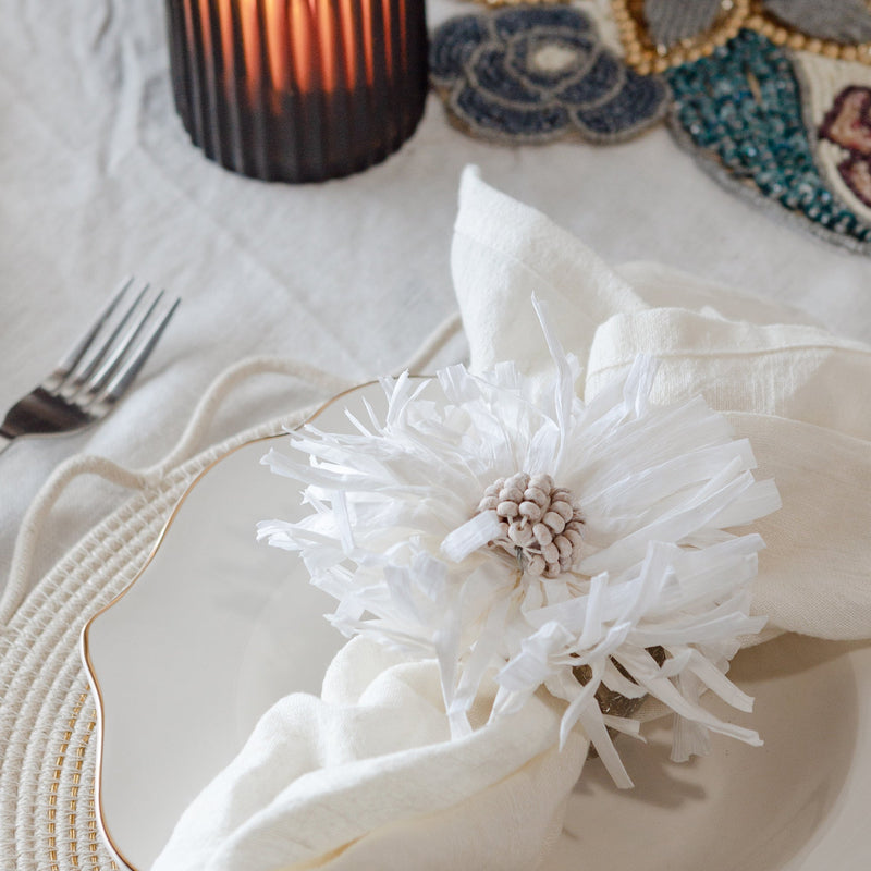 Handcrafted with exquisite beaded glass on cotton, every placemat, runner, and napkin ring boasts one-of-a-kind craftsmanship, featuring intricate patterns that sparkle and elevate your holiday meals. Perfect for layering, the Fiore napkin ring adds warmth, charm, and a touch of elegance to your table.