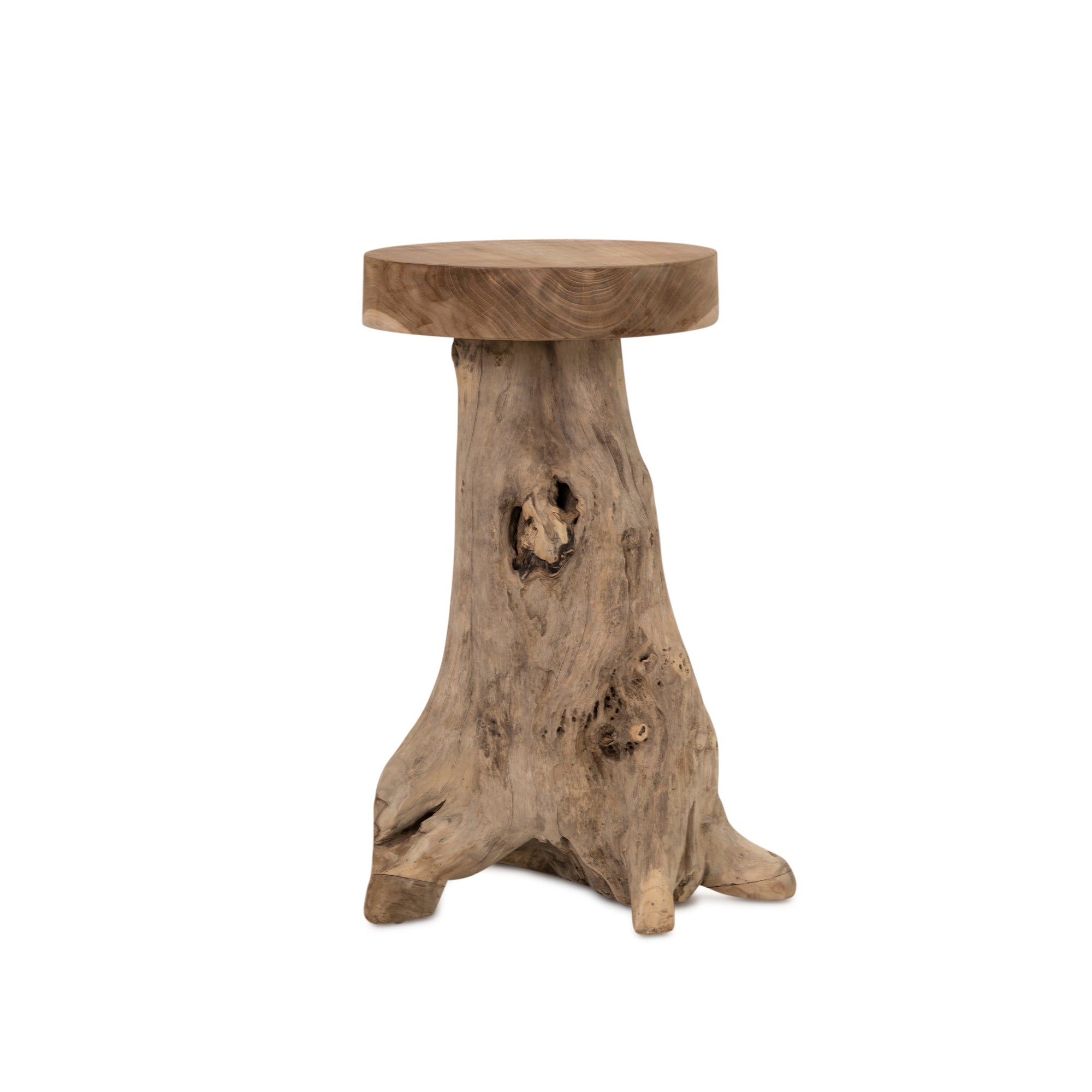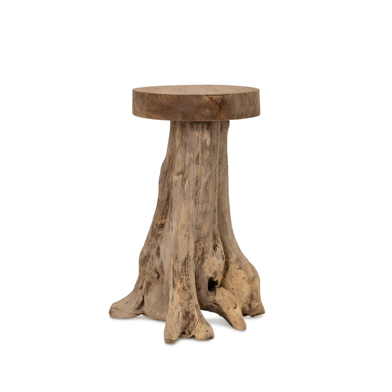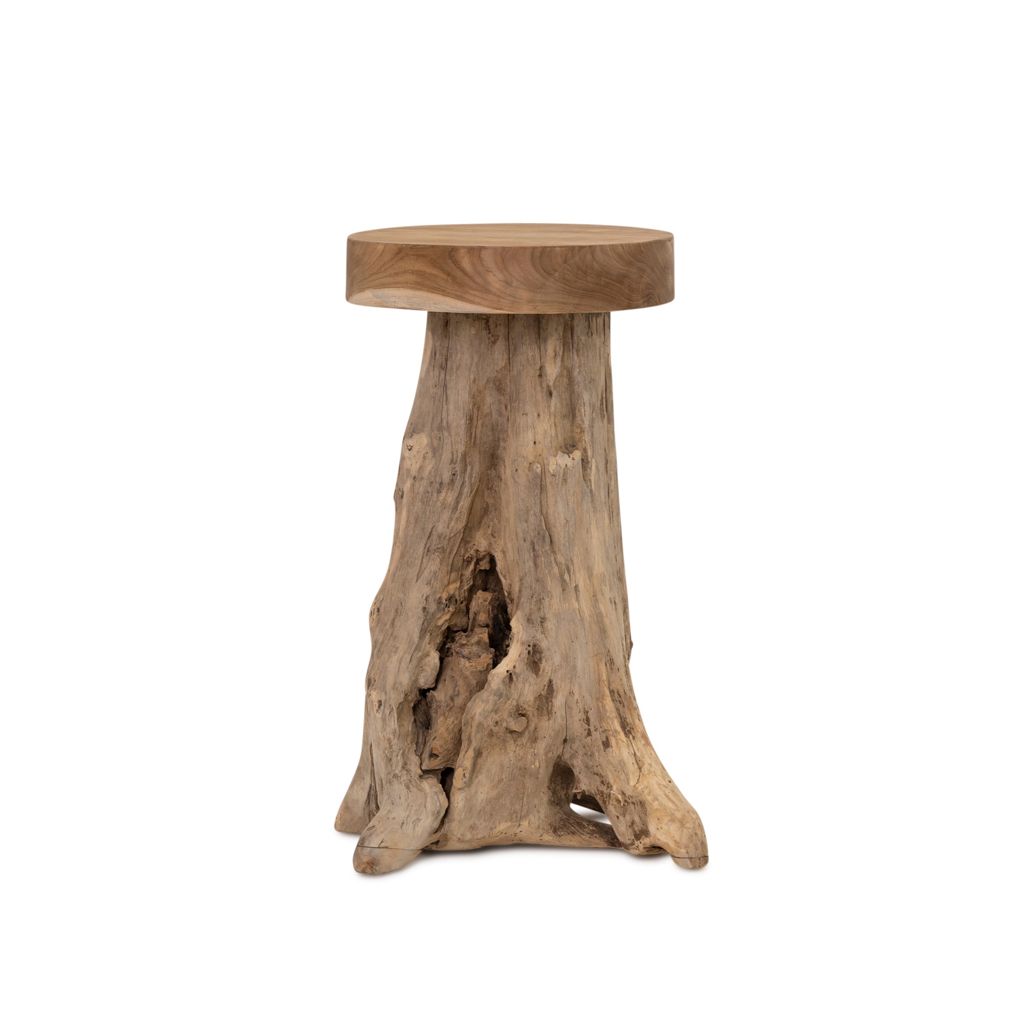 The Fungi Bar Stool, made of solid teak wood, exudes rustic charm and uniqueness. Featuring a handmade round seat top that provides a smooth and stable surface, with a unique root base.