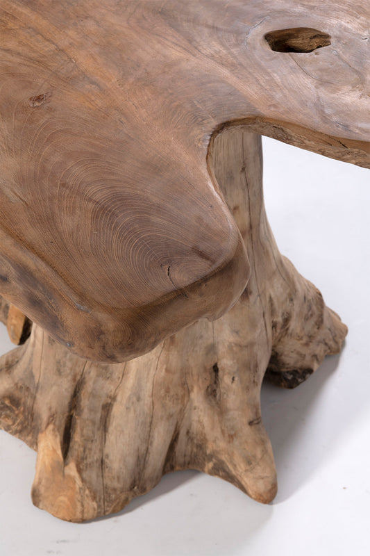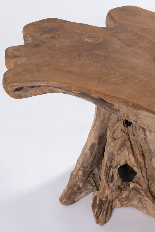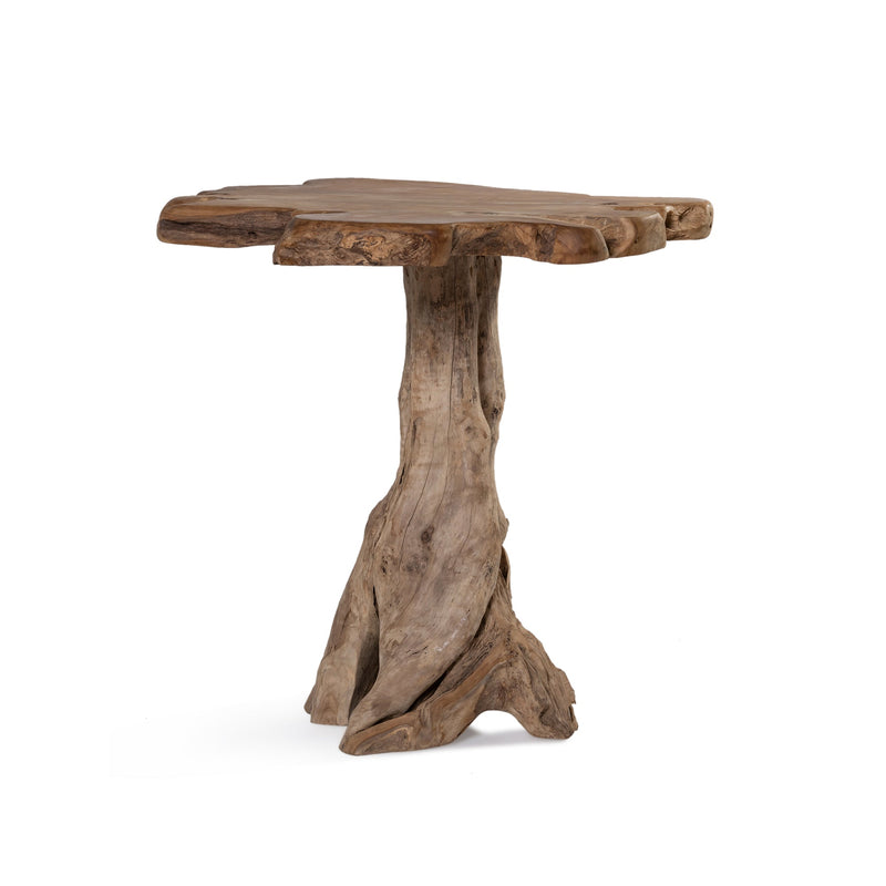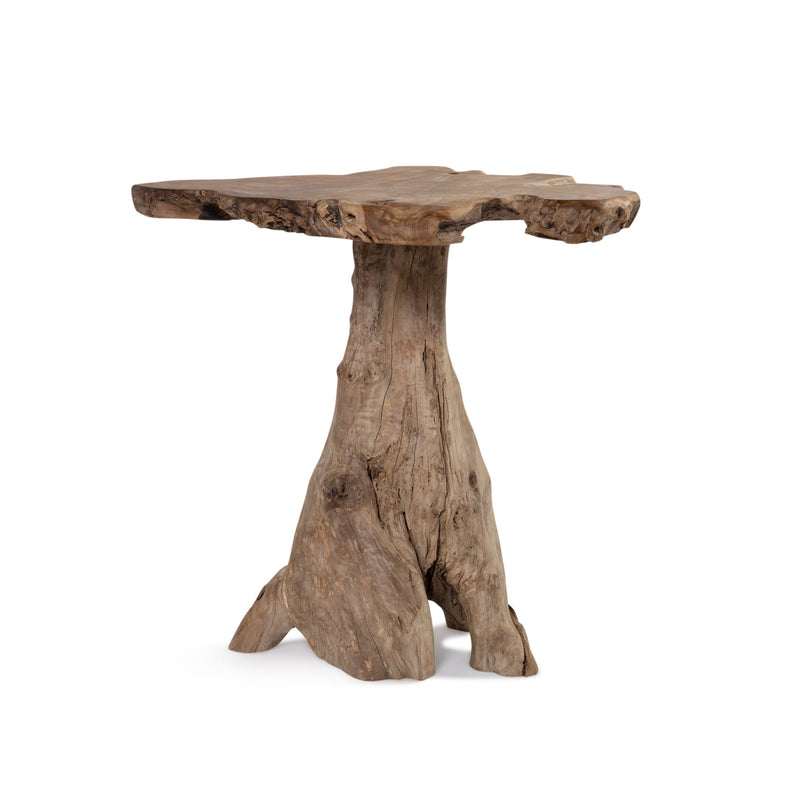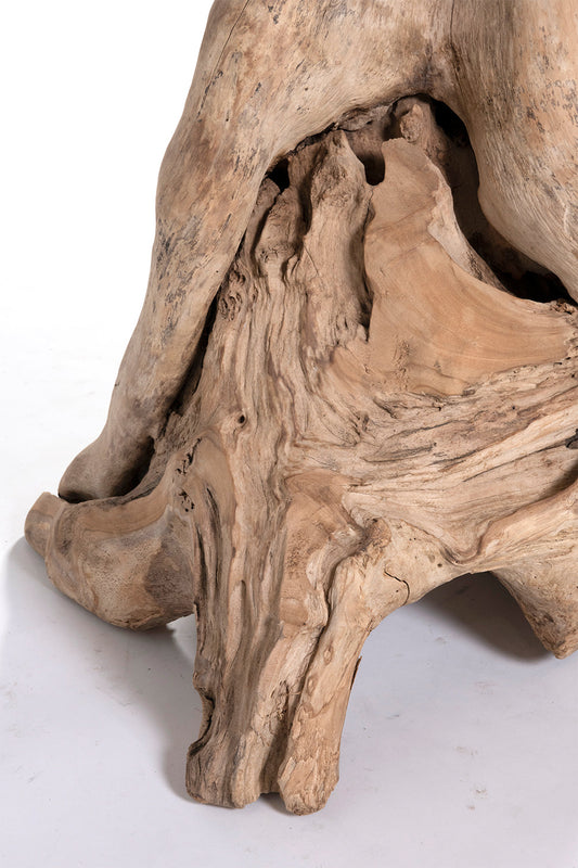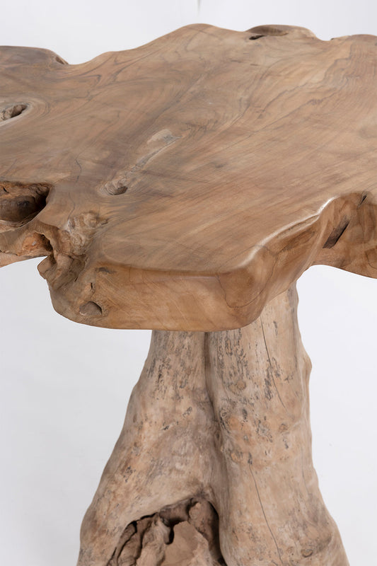 The fungi bar table, made of solid teak wood, exudes rustic charm and uniqueness. Featuring a handmade round tabletop that provides a smooth and stable surface, with the base made from the root of a teak tree.