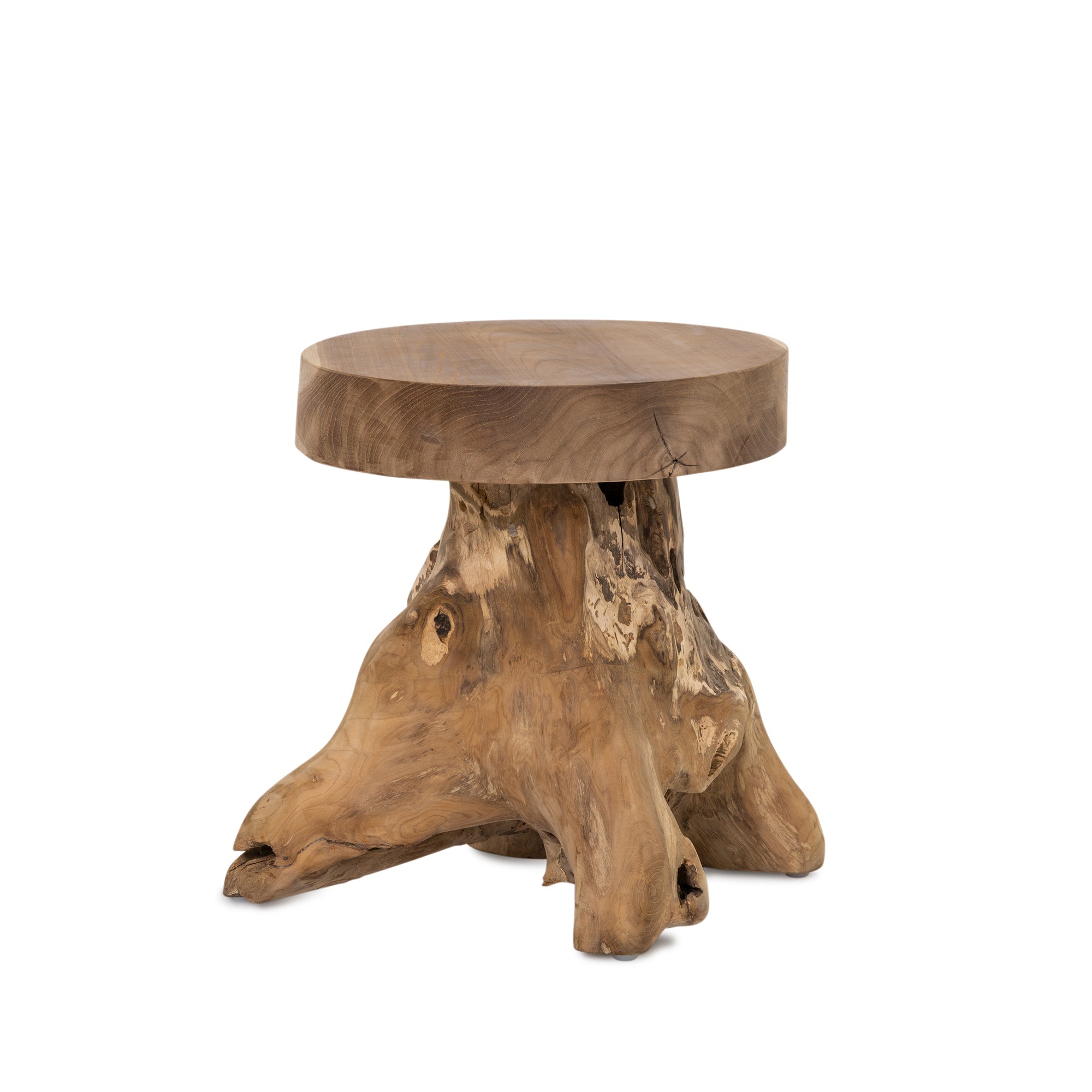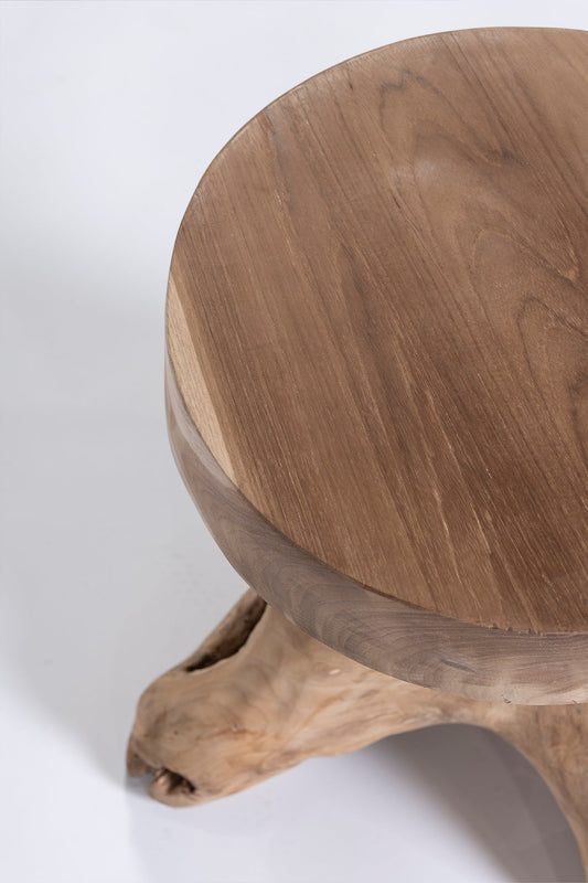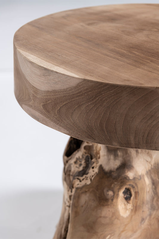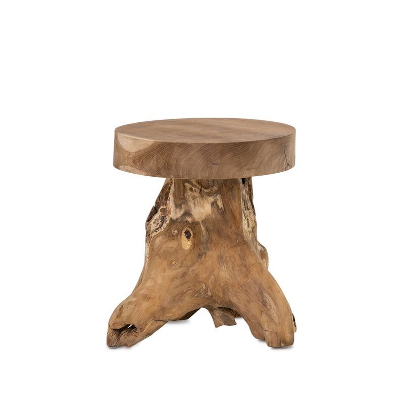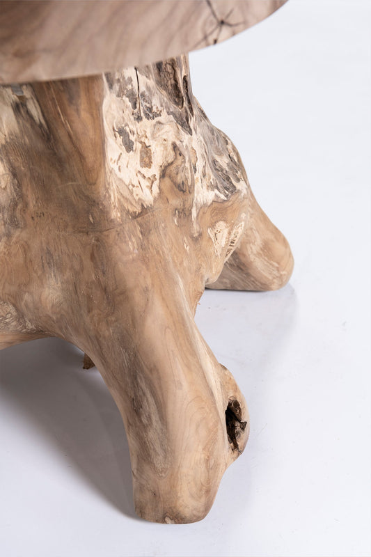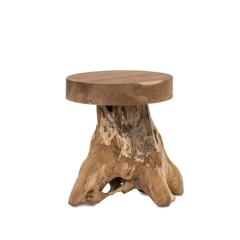The Fungi Stool, made of solid teak wood, exudes rustic charm and uniqueness. Featuring a handmade round seat top that provides a smooth and stable surface, with a unique root base.