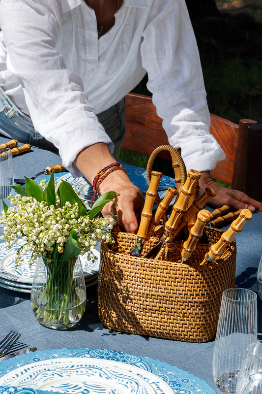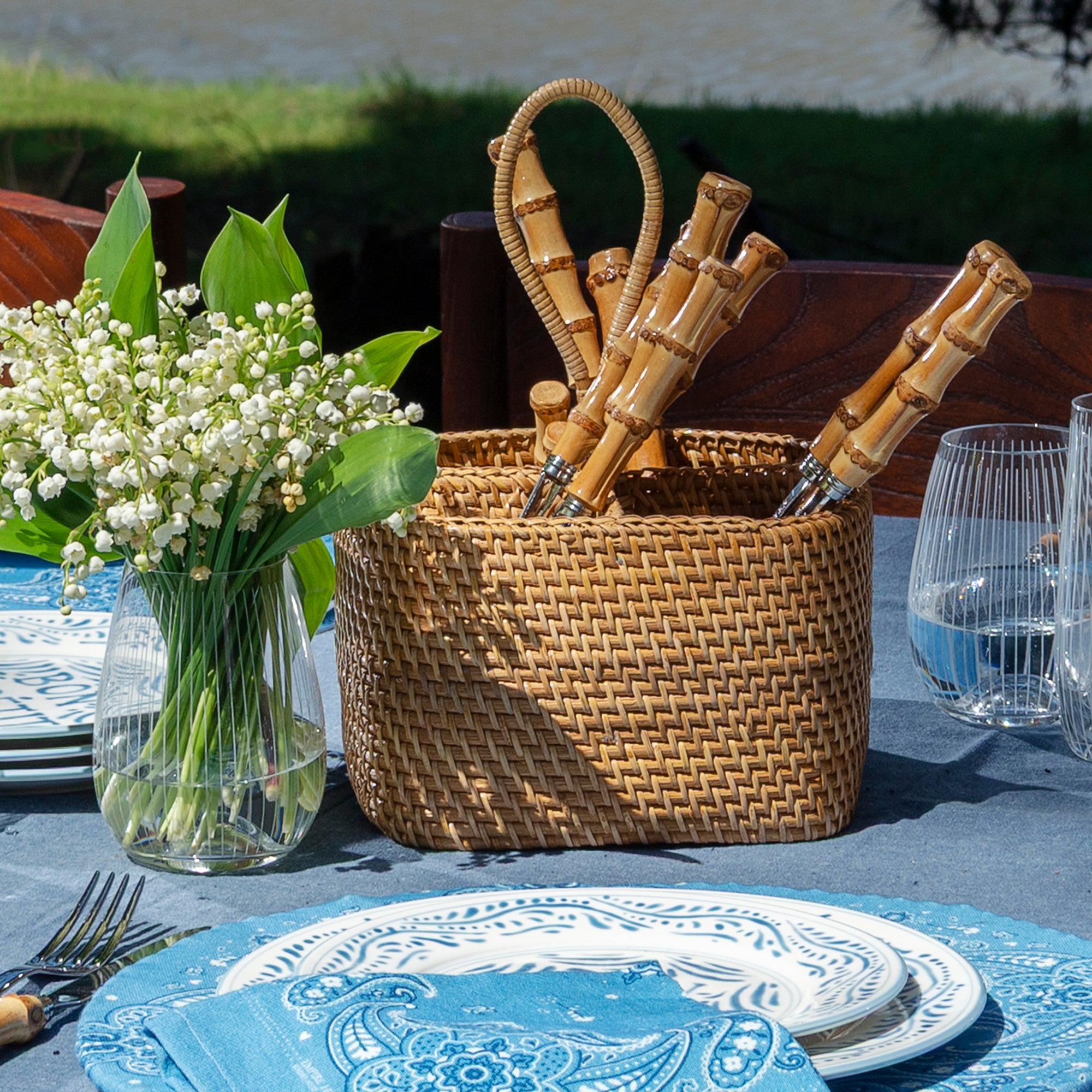 A beautifully handwoven cutlery holder that brings a touch of natural warmth to any table setting. Crafted from durable woven rattan, its structured form keeps utensils neatly organised while adding texture and character to the dining experience. Perfect for everyday entertaining, alfresco lunches or holiday tablescapes alike.