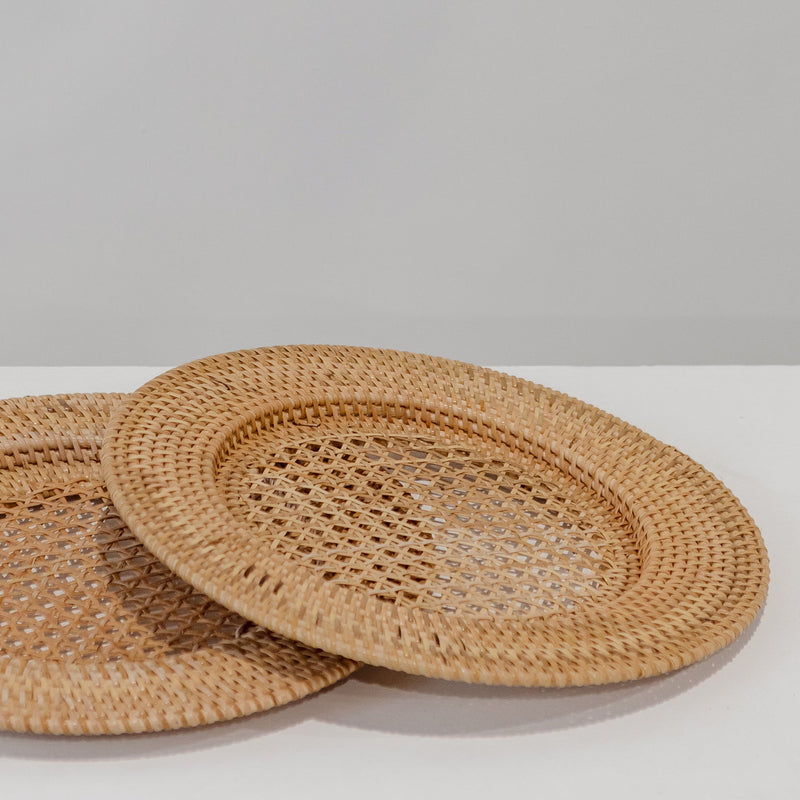 Serving as an elegant base for your dinner plates or soup bowls, the Lombok Plate Charger adds a touch of organic charm to your table setting. Handcrafted with natural rattan, available in black or natural.