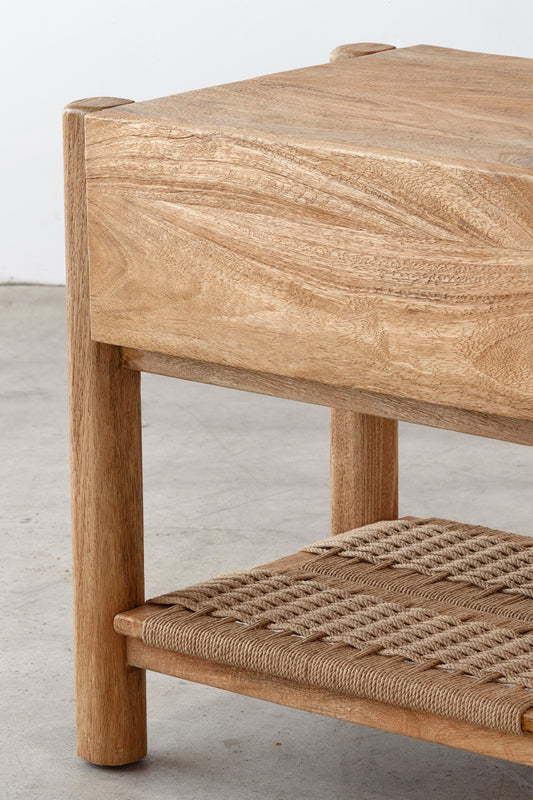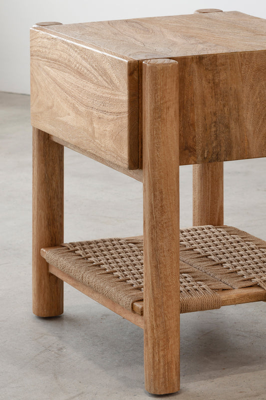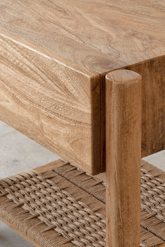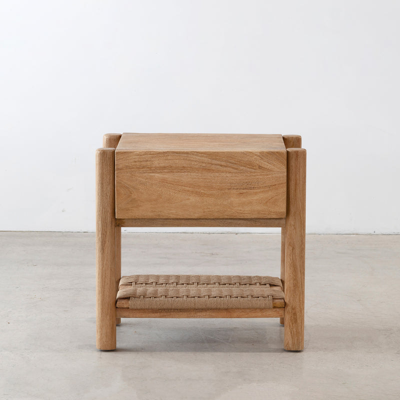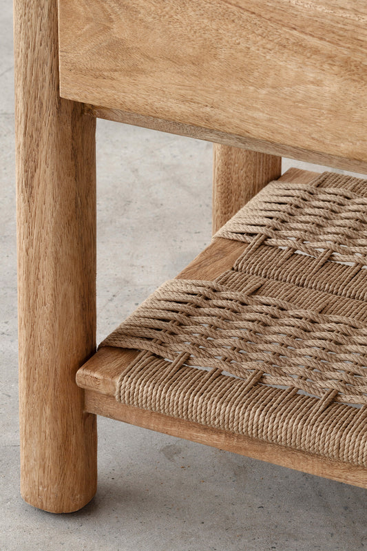 Finished in a soft rustic matte tone, the Lou Lou Bedside highlights the natural grain and understated character of the wood. Its rounded legs and clean, balanced proportions create a timeless silhouette, while the woven lower shelf introduces subtle texture and practical storage. A versatile bedside design suited to both relaxed and refined bedroom settings.