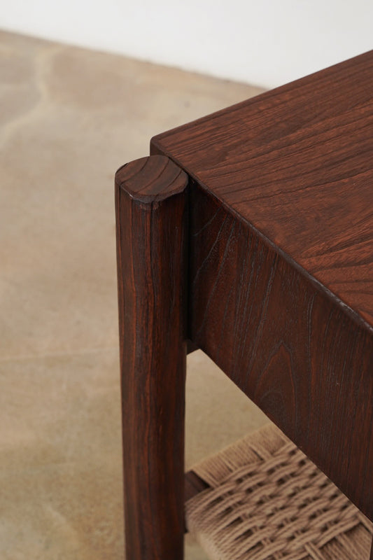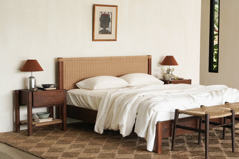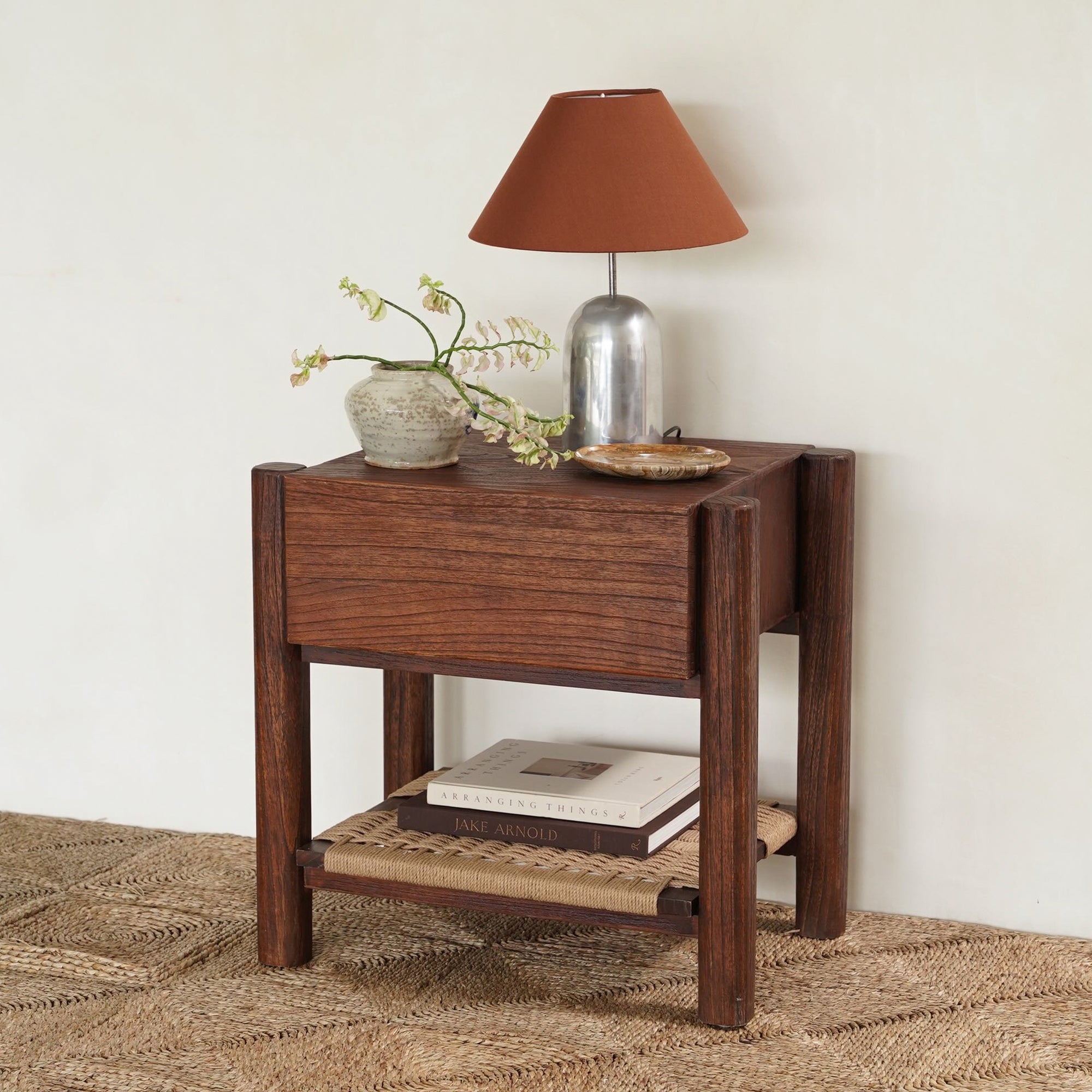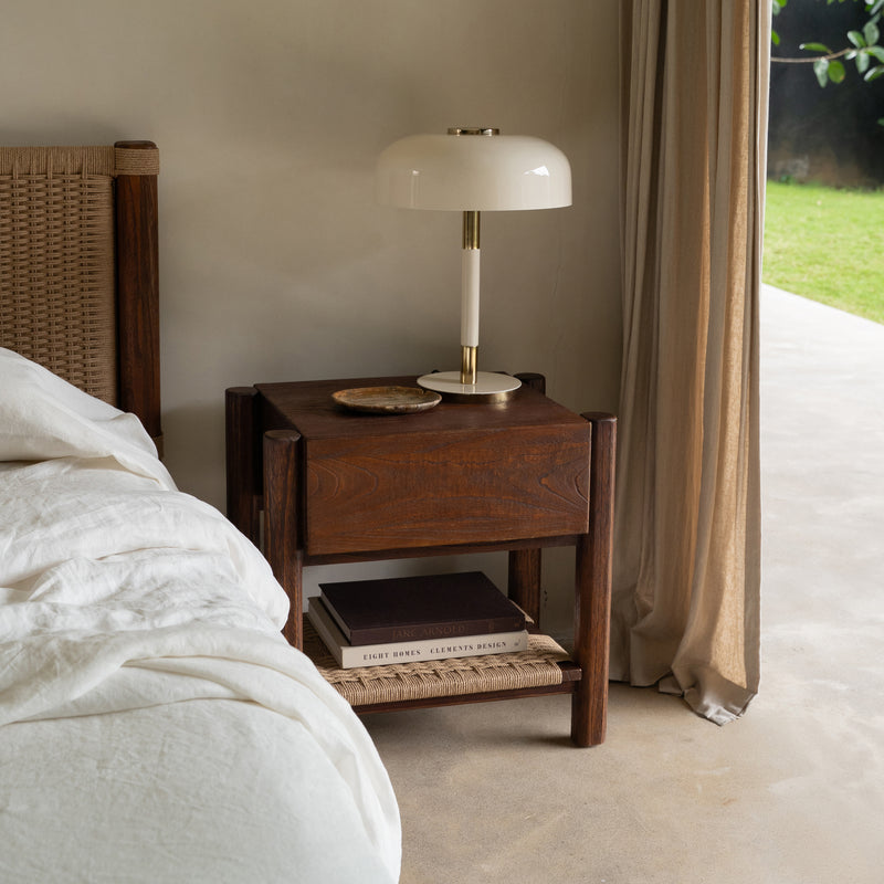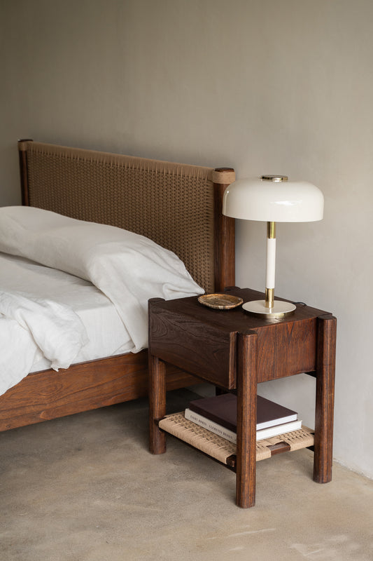 Finished in a warm rustic walnut tone, the Lou Lou Bedside showcases the natural character and depth of the wood grain. Its softly rounded legs and clean-lined form create a timeless bedside design, while the woven lower shelf adds subtle texture and functional storage. A considered piece that brings warmth and balance to the bedroom.