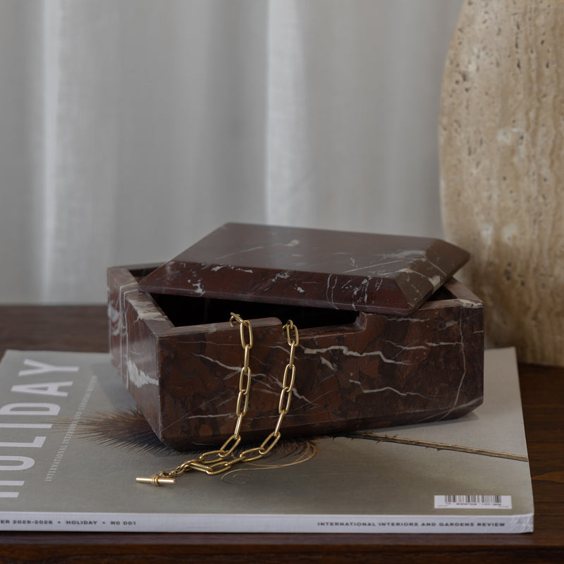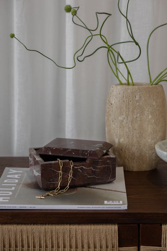 A refined decorative accent for consoles, shelving or bedside styling, the Marble Box in Red Levanto brings rich colour and timeless elegance to any interior. Defined by its deep red tone and natural veining, it offers a striking balance of form and function, perfect for storing small essentials while adding a sculptural element to your space.
