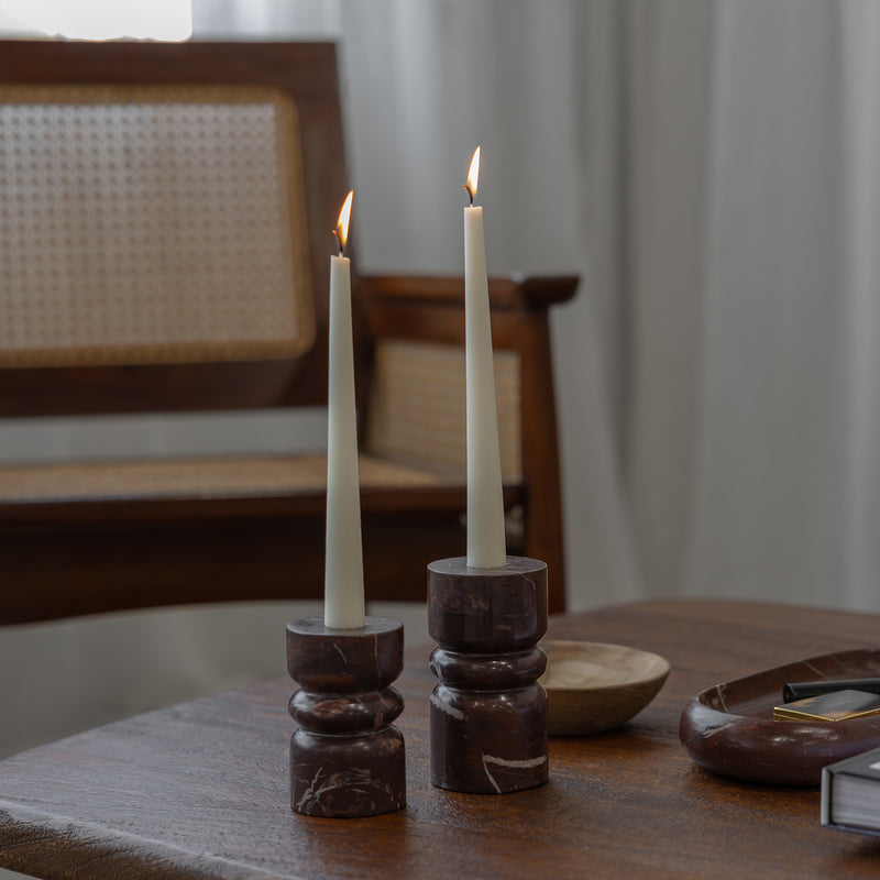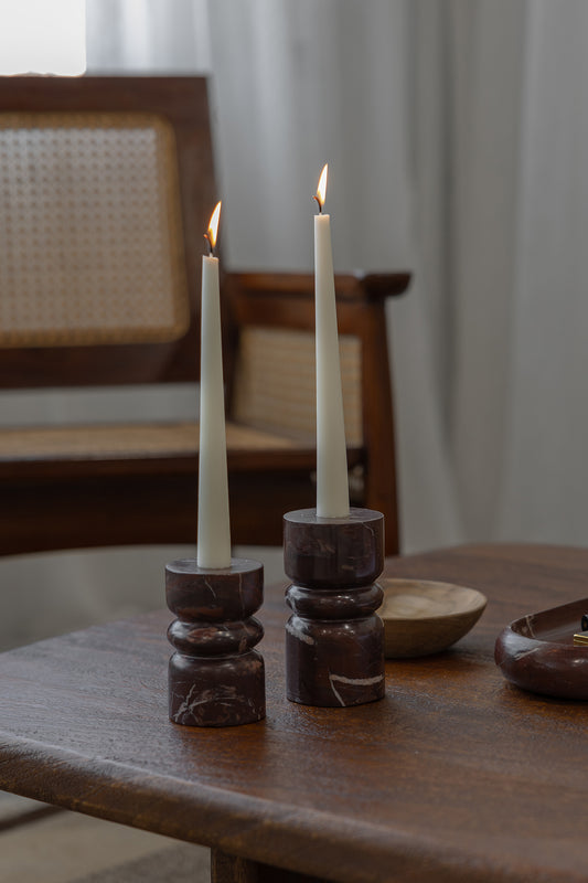 A sculptural accent for consoles, shelves or dining styling, the Marble Candle Holder in Red Levanto brings rich colour and timeless character to any interior. Defined by its turned silhouette and striking natural veining, it offers a beautiful balance of form and functional perfect for adding warmth and atmosphere to your space.