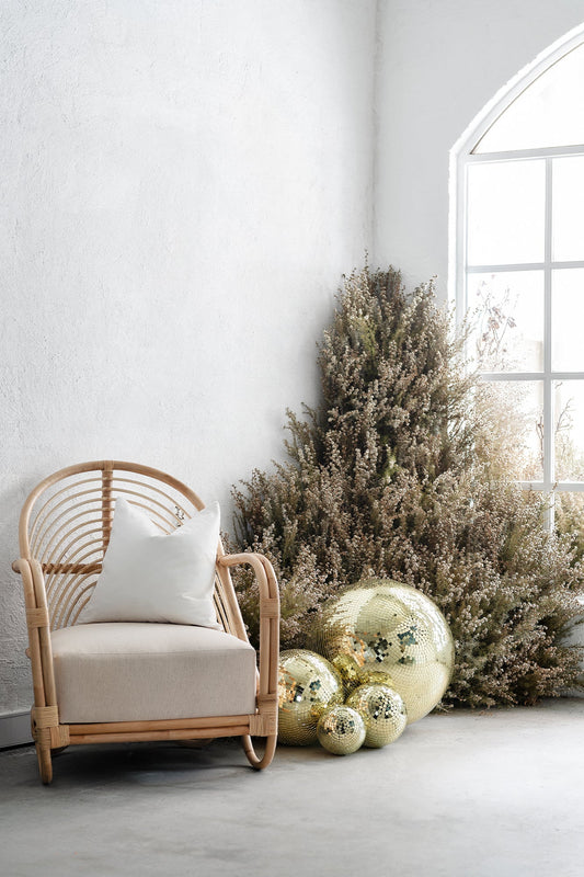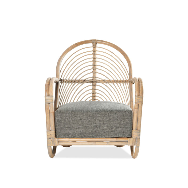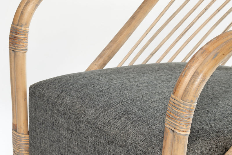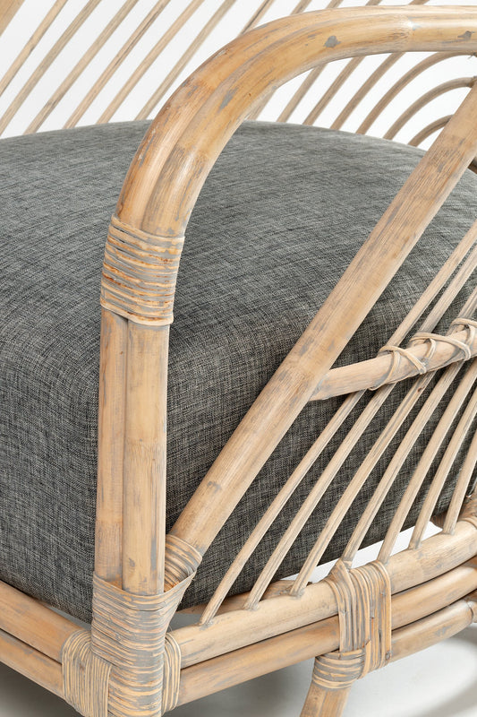 Durable rattan frame occasional chair with detailed rattan backrest and comfortable fabric cushion seat.