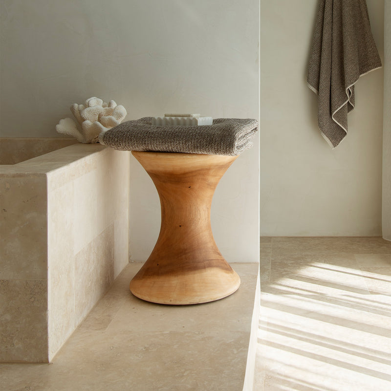 Constructed from raw meh wood in a curved hourglass shape. This hardwood stool is highly durable. Colours/finishes between items may vary and some slightly cracking can occur, due to the natural nature of the timber.